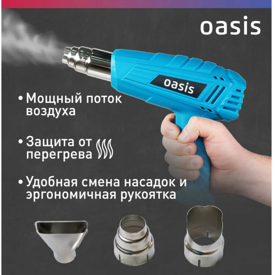 Строительный фен OASIS TG-20 2000 Вт; Рабочая температура 350/600 ℃;300/500 л/мин ; защита от перегрева интересное: