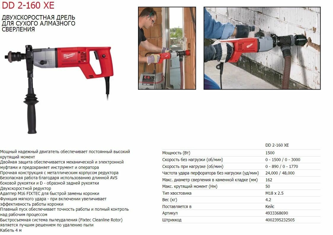 Дрель для сухого алмазного бурения DD2- 160XE Milwaukee 4933368690 Оригинал интересное: