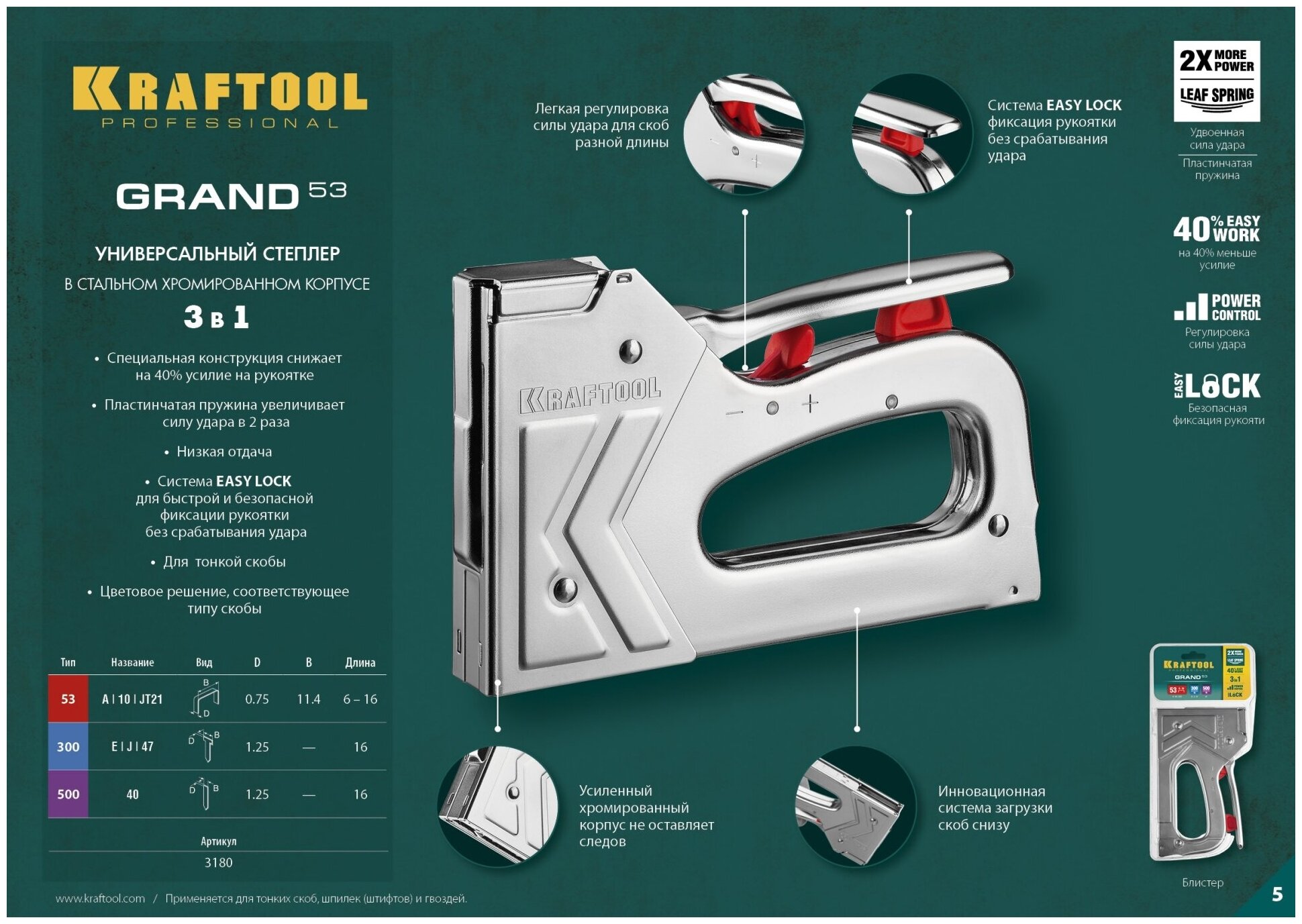 KRAFTOOL скобы тип 53, 300, 500, степлер для скоб 3-в-1 GRAND-53 3180