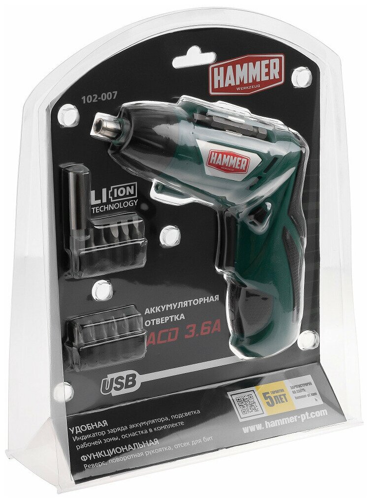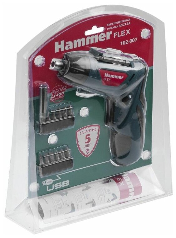 Аккумуляторная отвертка Hammer ACD3.6A с набором бит 3,6В 1,3Ач 4Нм Li-Ion
