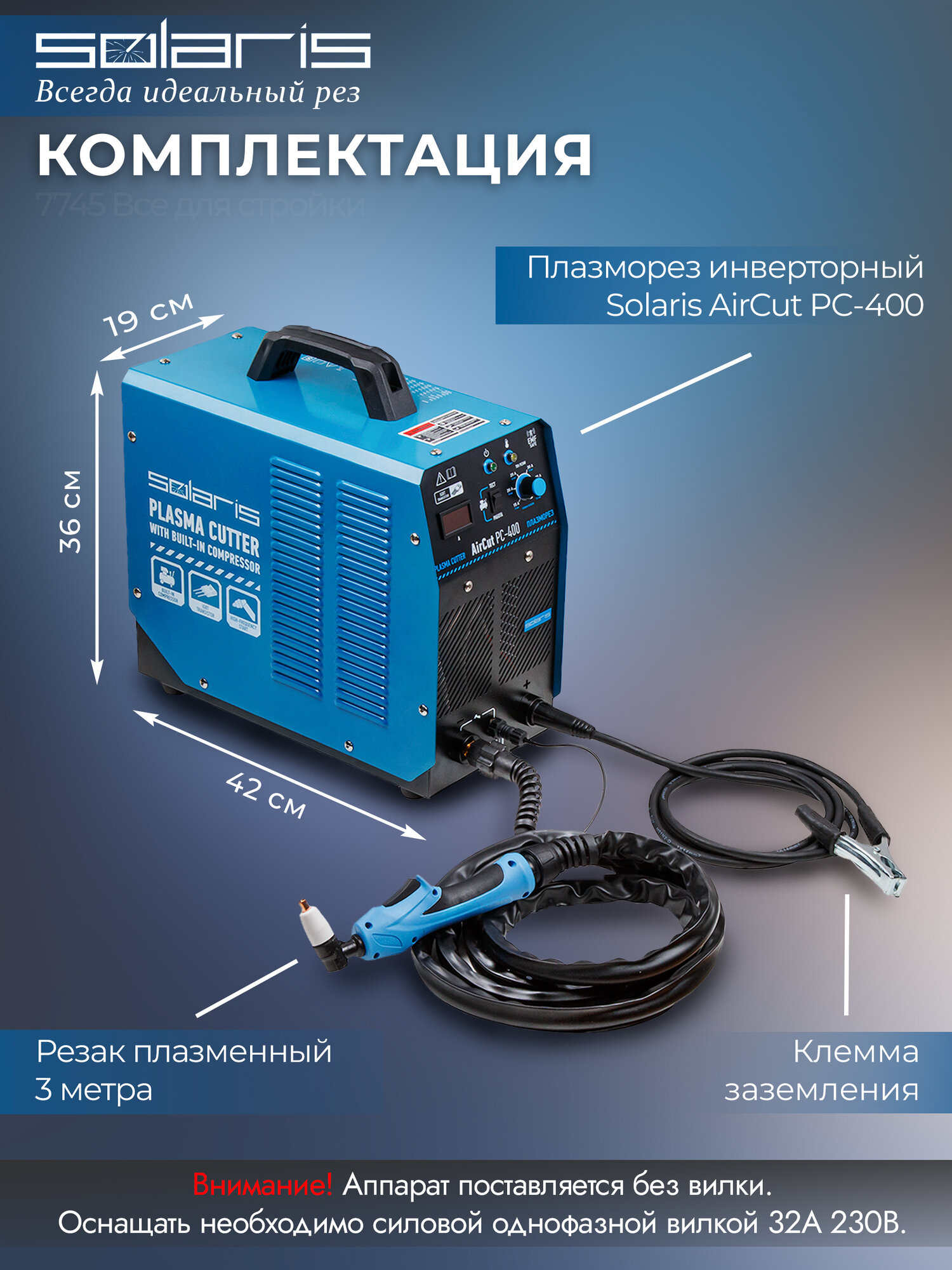 Solaris Плазморез AirCut PC-400 (220 В, 15-40 А, Высоковольтный поджиг, встроен.компрессор, термозащита, плавный запуск) ()