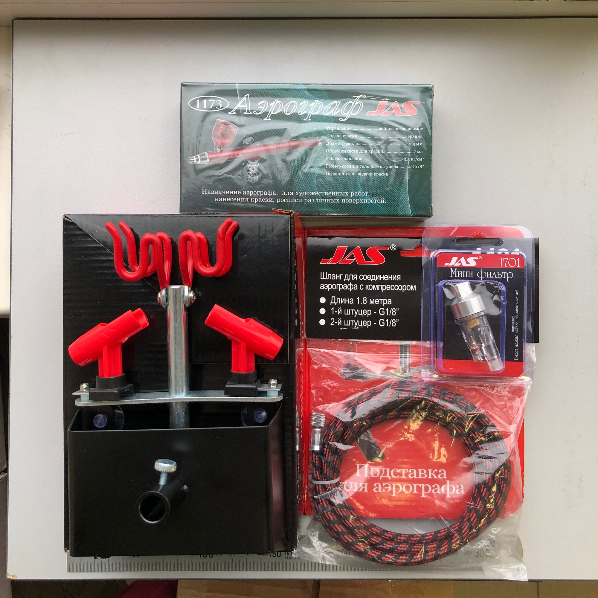 Аэрограф 1173 (штуцер G1/8, сопло 0.3 мм, емкость бачка 7 мл, верхняя подача) с подставкой, дополнительным фильтром и шлангом для подключения к компрессору, JAS (Китай) интересное: