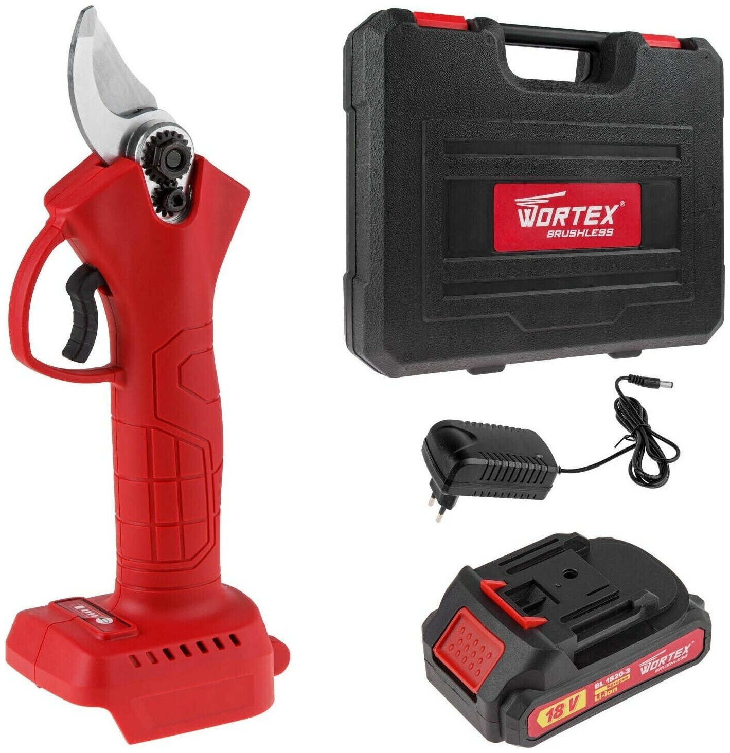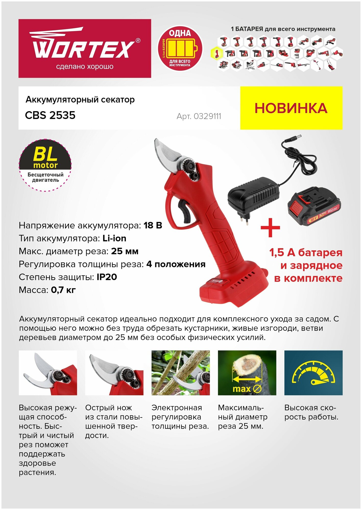 Аккум. секатор WORTEX CBS 2535 ALL1 в чем. Бесщет., 18 В, ветки до 25 мм, 1х1.5 А*ч (0329111)