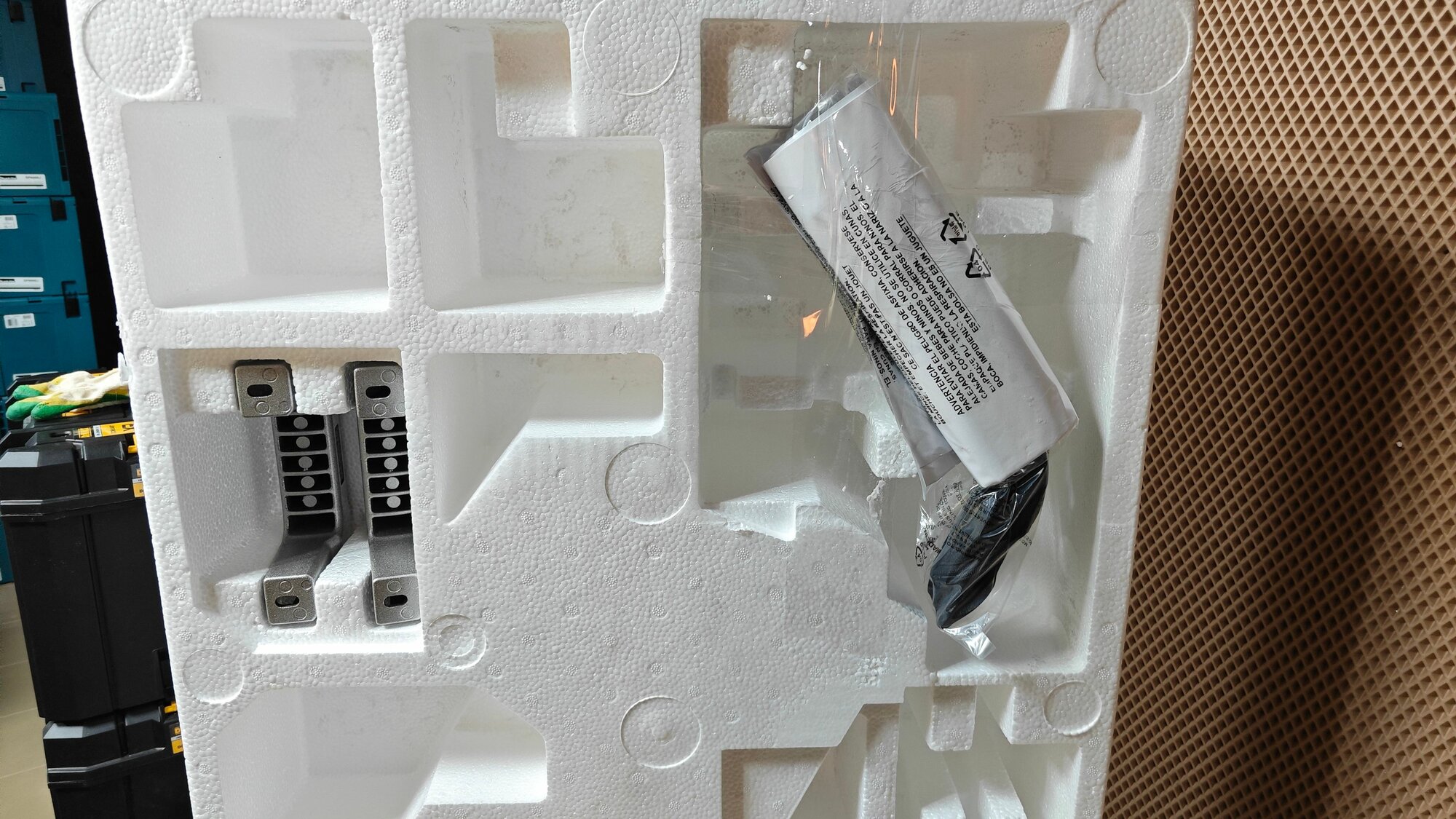 Не удачная конфигурация упаковки (внутренних картонных перегородок) корпус мотора немного потёрся. Не удобна сама коробка, нет ручек для переноса. Тяжеловата, но это связано с большим резом, чем меньше пропил, тем меньше и легче торцовка. |