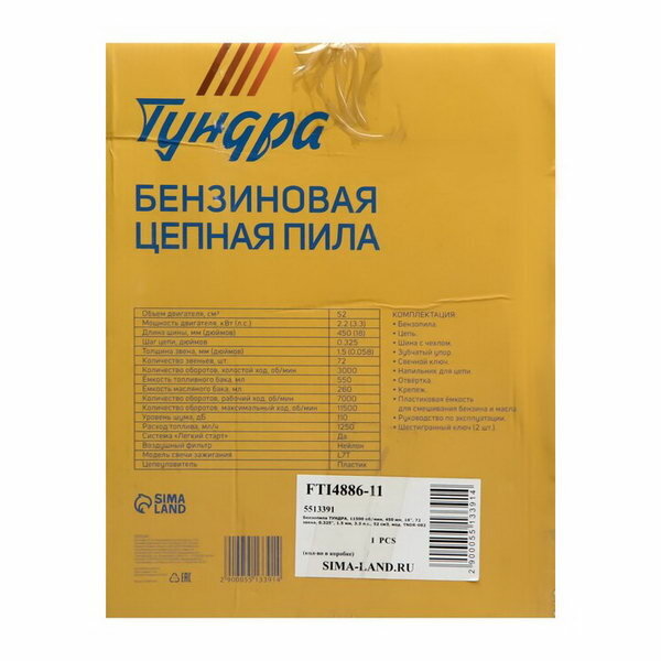 Бензопила тундра, 11500 об/мин, 450 мм, 18", 72 звена, 0.325", 1.5 мм, 3.3 л.с., 52 см3 тундра 55133
