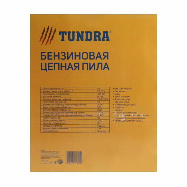 Бензопила тундра, 11500 об/мин, 450 мм, 18", 72 звена, 0.325", 1.5 мм, 3.3 л.с., 52 см3 5513391