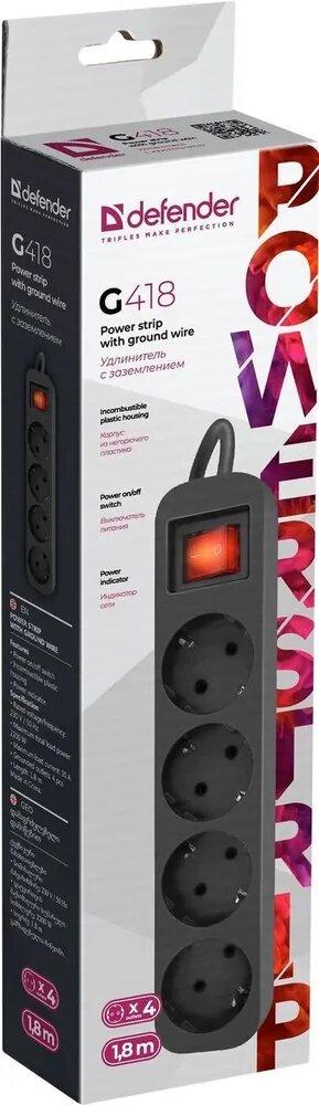 Удлинитель Defender G418 (99337), 4 розетки, 1.8 м, с/з, 10А / 2200 Вт черный