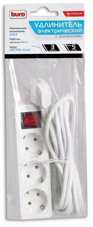 Сетевой удлинитель Buro Bu-ps3.5/w 5м (3 розетки) белый (пакет ПЭ)