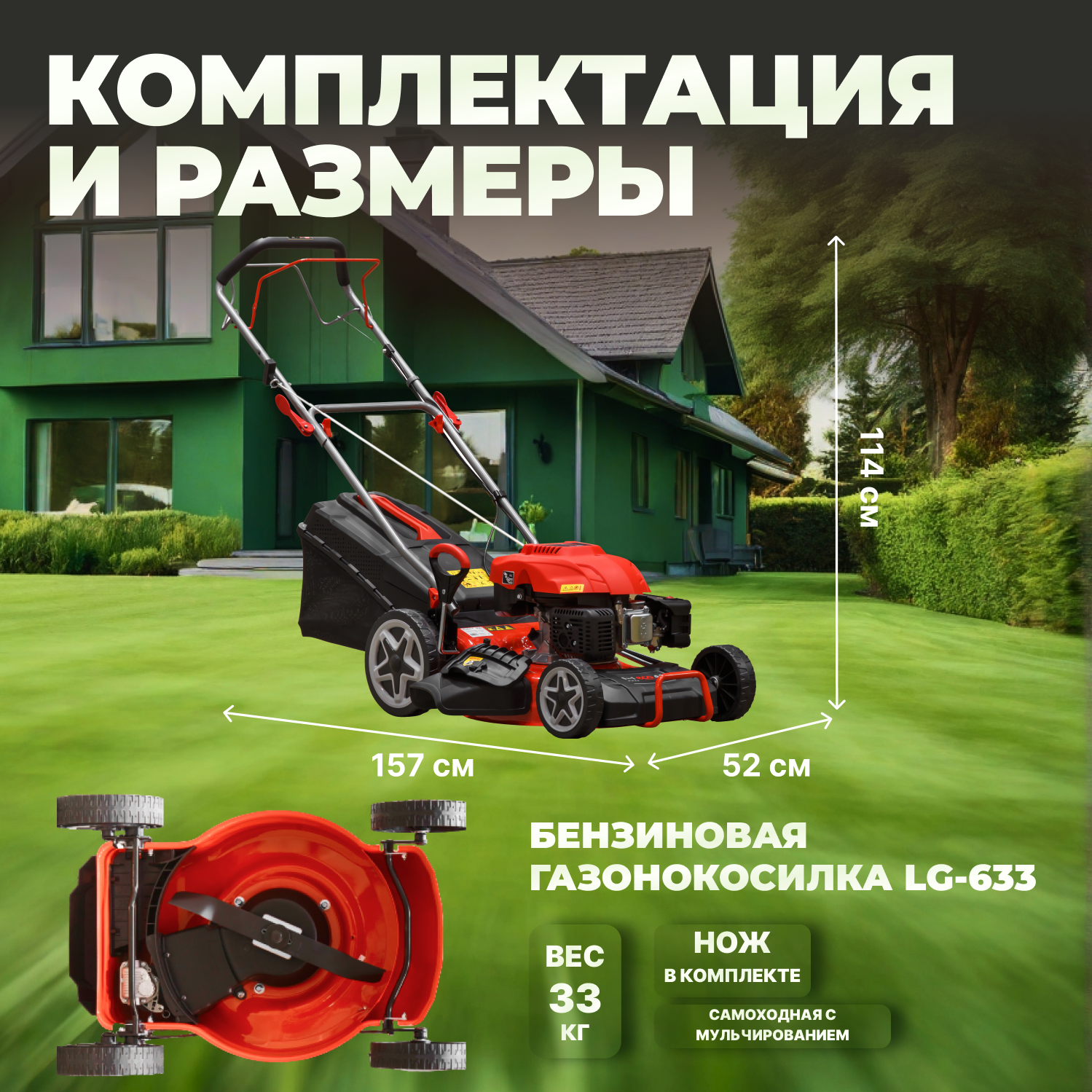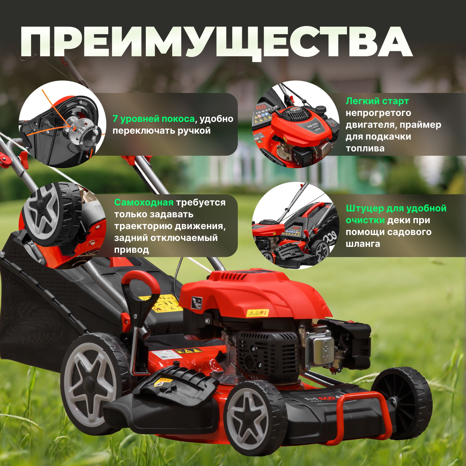 Газонокосилка бензиновая самоходная с мульчированием ECO LG-633, ширина скоса 46 см, травосборник 60 л, стальной корпус интересное: