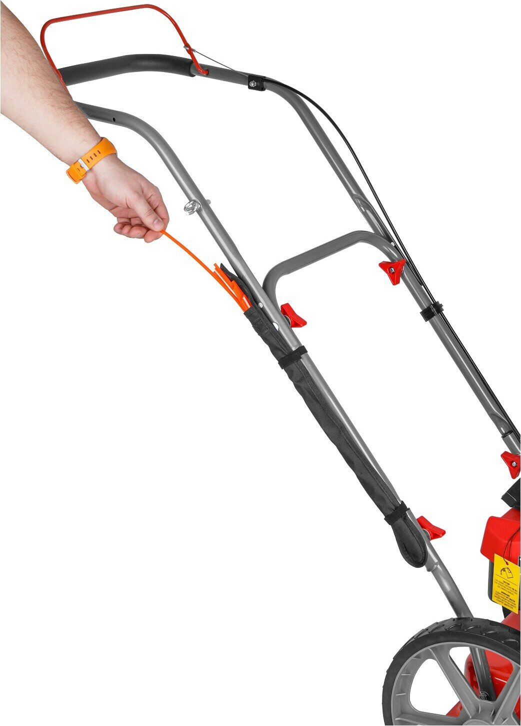 Хорошая ширина прокоса, позволяет делать меньше заходов. Регулировка по высоте скашивания на 7 точек. Газонокосилка удобная в управлении, простая в обслуживании.