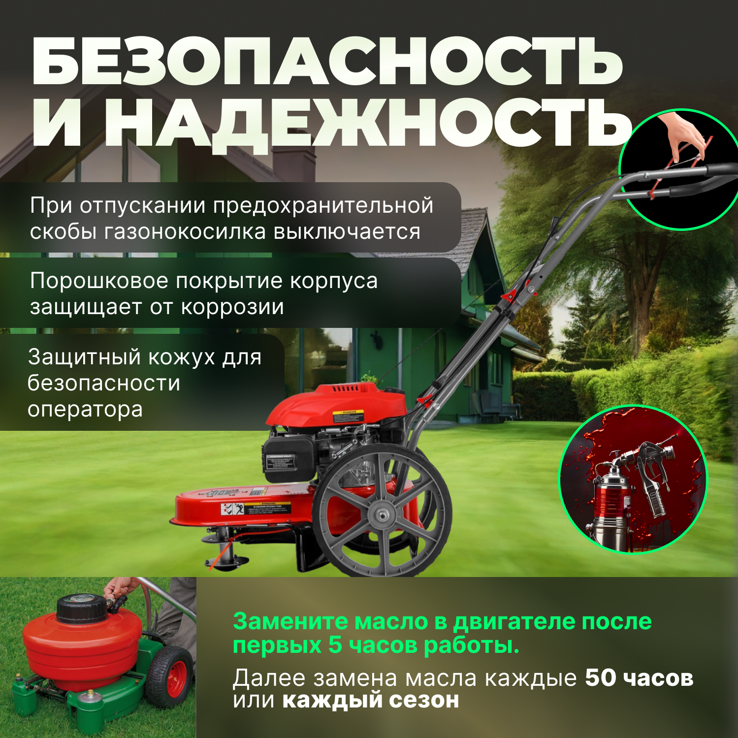 Мощность, самоход, широкий диапазон регулировки высоты скашивания,