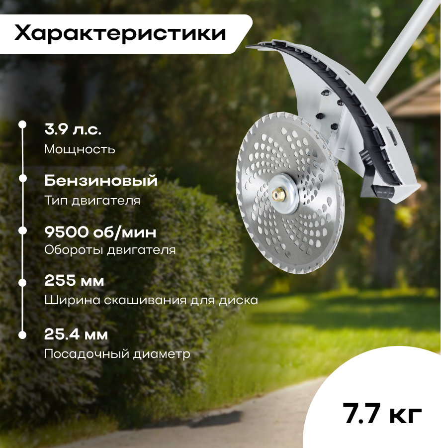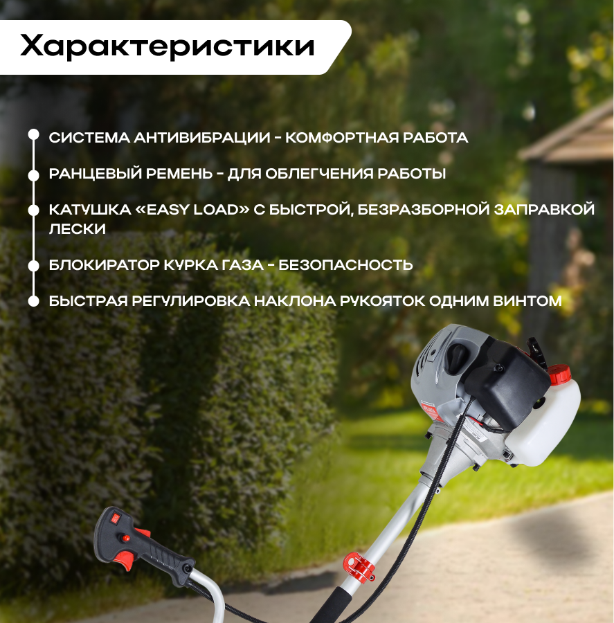 | Подробная комплектация | двигатель в сборе - 1 шт.; штанга в сборе с редуктором - 1 шт.; защитный кожух - 1 шт.; режущий диск - 1 шт.; катушка с леской - 1 шт.; нож для более высокой и плотной травы - 1 шт.; рукоятки управления (левая и правая) - 1 шт.; ранцевый ремень - 1 шт.; комплект ключей - 1 шт.; паспорт продукции - 1 шт |