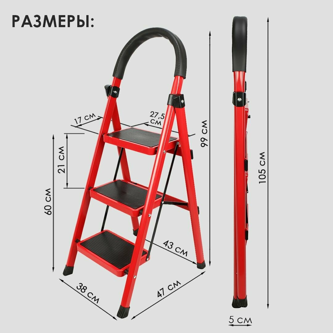 Купить Стремянка лестница 3 ступени стальная складная высокая для дома, кухни, садовая (990х470х380 мм) с широкими ступенями