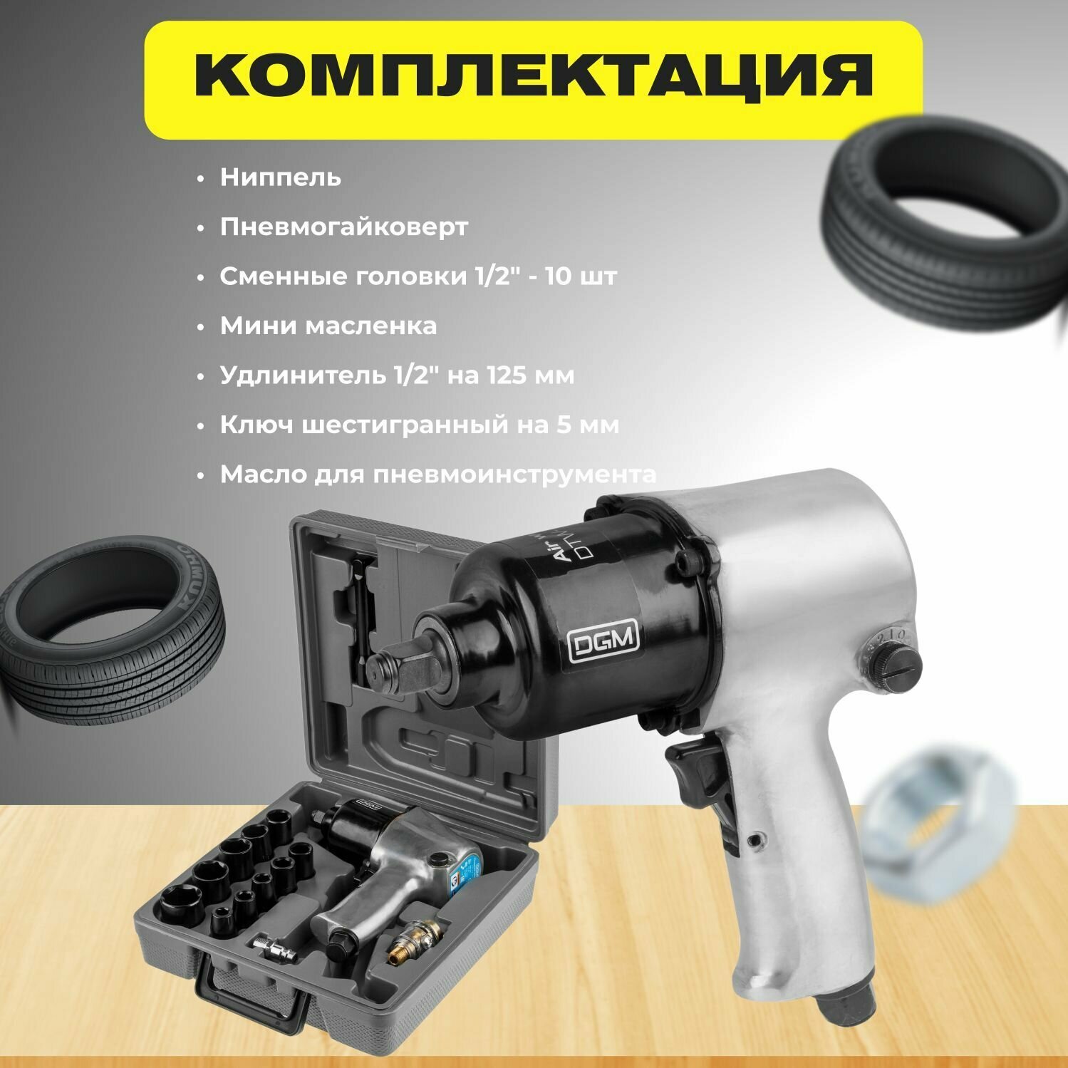 Пневмогайковерт DGM DTW-7012, 1/2, с лубрикатором и головками