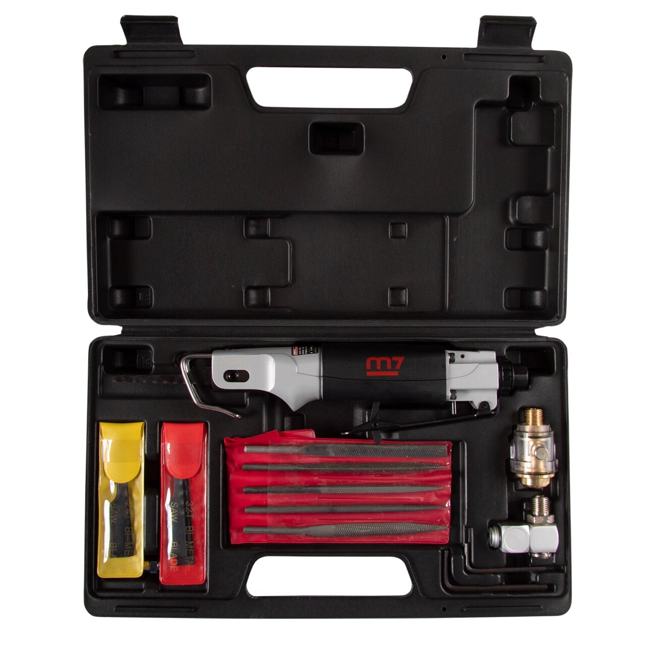 | Комплектация | 5 надфилей; переходник пневматический, вращающийся 360° 1/4"; ключ шестигранный 3 мм и 4 мм; лубрикатор 1/4"; 6 сменных пилок 24 зуба; 6 сменных пилок 32 зуба |