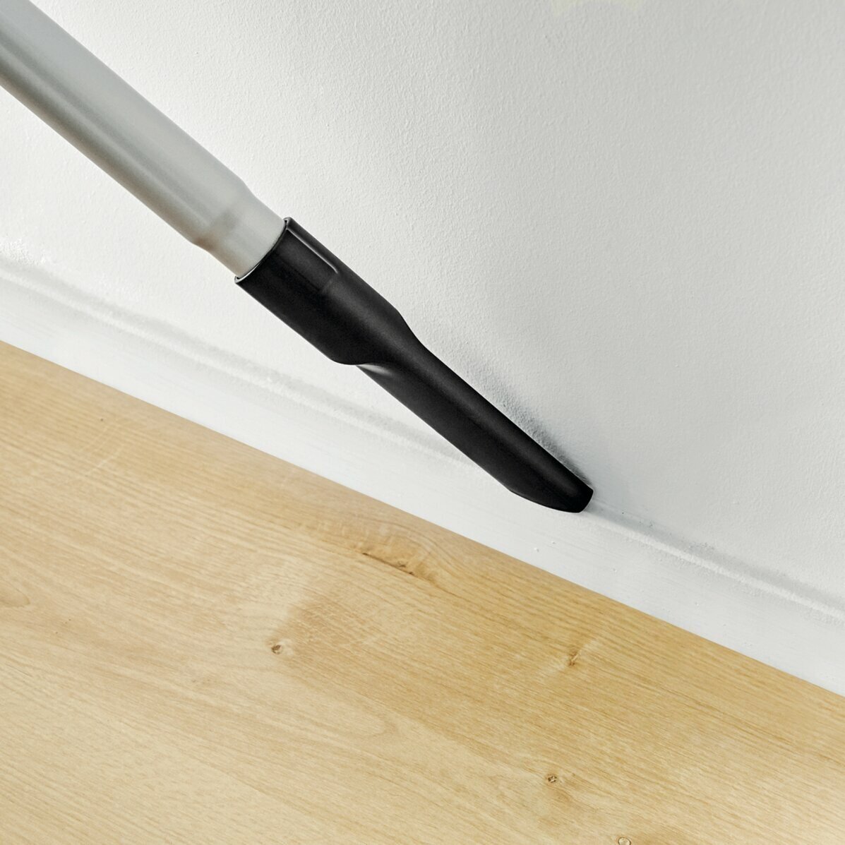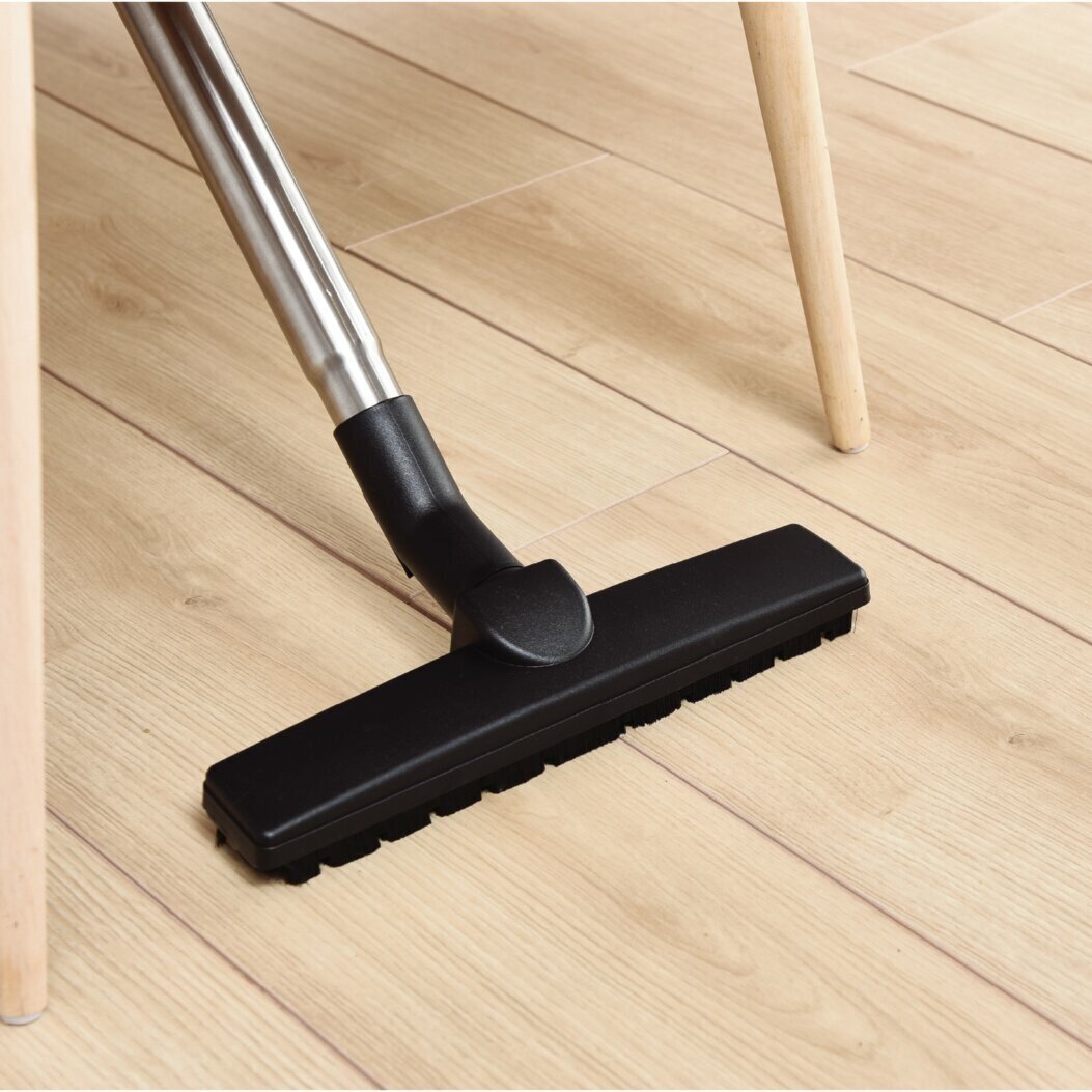 В комплекте идёт основная щётка. Щётка для паркета и плитки. Насадка для мебели и насадка для плинтусов. Гибкий шланг крепится надёжно, вставляешь и поворачиваешь на 90 градусов - всё, он закреплён. Все остальные детали крепятся - вставил и всё. Но ничего не болтается. Он достаточно тихий, серьёзно! Можно спокойно разговаривать не повышая голоса. |
