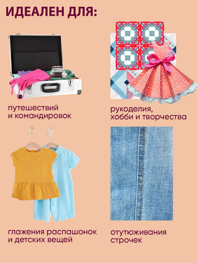 | Отзыв: | Легко гладить мелкие детали: рюши, оборки, воротники и манжеты и т.д. Удобно брать с собой в путешествия. |