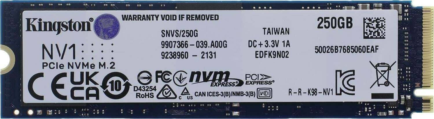 250 ГБ SSD M.2 накопитель Kingston NV1 (SNVS/250G) - PCI-E 3.x x4, чтение - 2100 Мбайт/сек, запись - 1100 Мбайт/сек, 3D NAND, 3 бит TLC, NVM Express