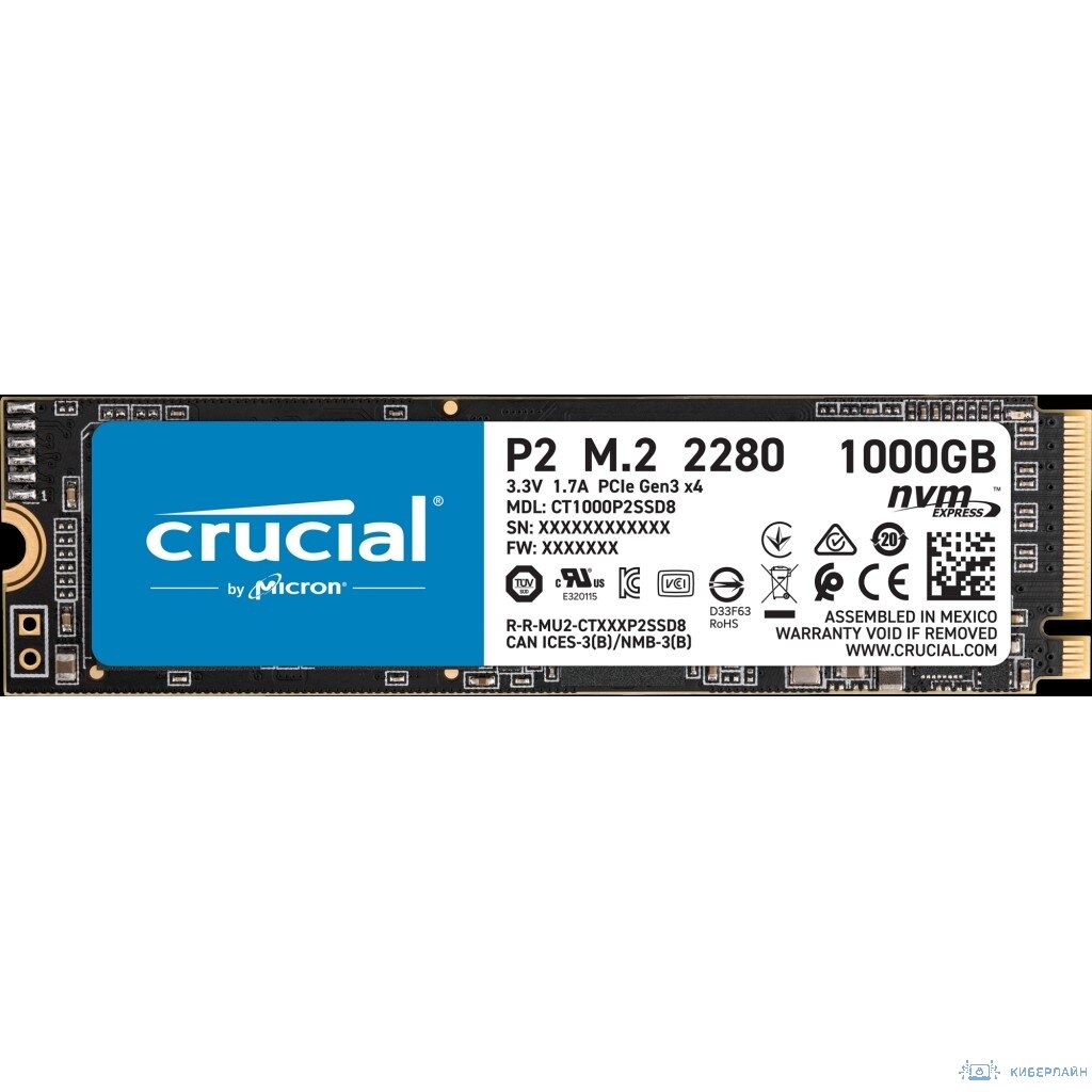 Твердотельный накопитель Crucial P2 SSD 1000GB, M.2 (2280), PCIe Gen 3.0 CT1000P2SSD8