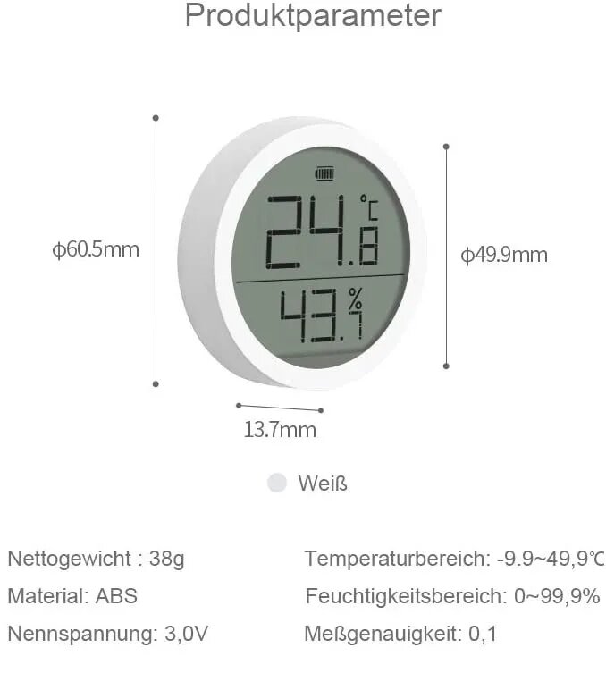 | Дополнительная информация | умный термометр-гигрометр с дисплеем LCD предназначенный для измерения температуры и влажности в помещении; оснащен датчиком промышленного класса и электронными компонентами от Sensirion; имеет долгое время работы, до 1 года от одной батарейки; с приложением Mihome можно не только читать информацию, находясь вдали от дома, но и получать уведомления об аномальных перепадах температуры и влажности |