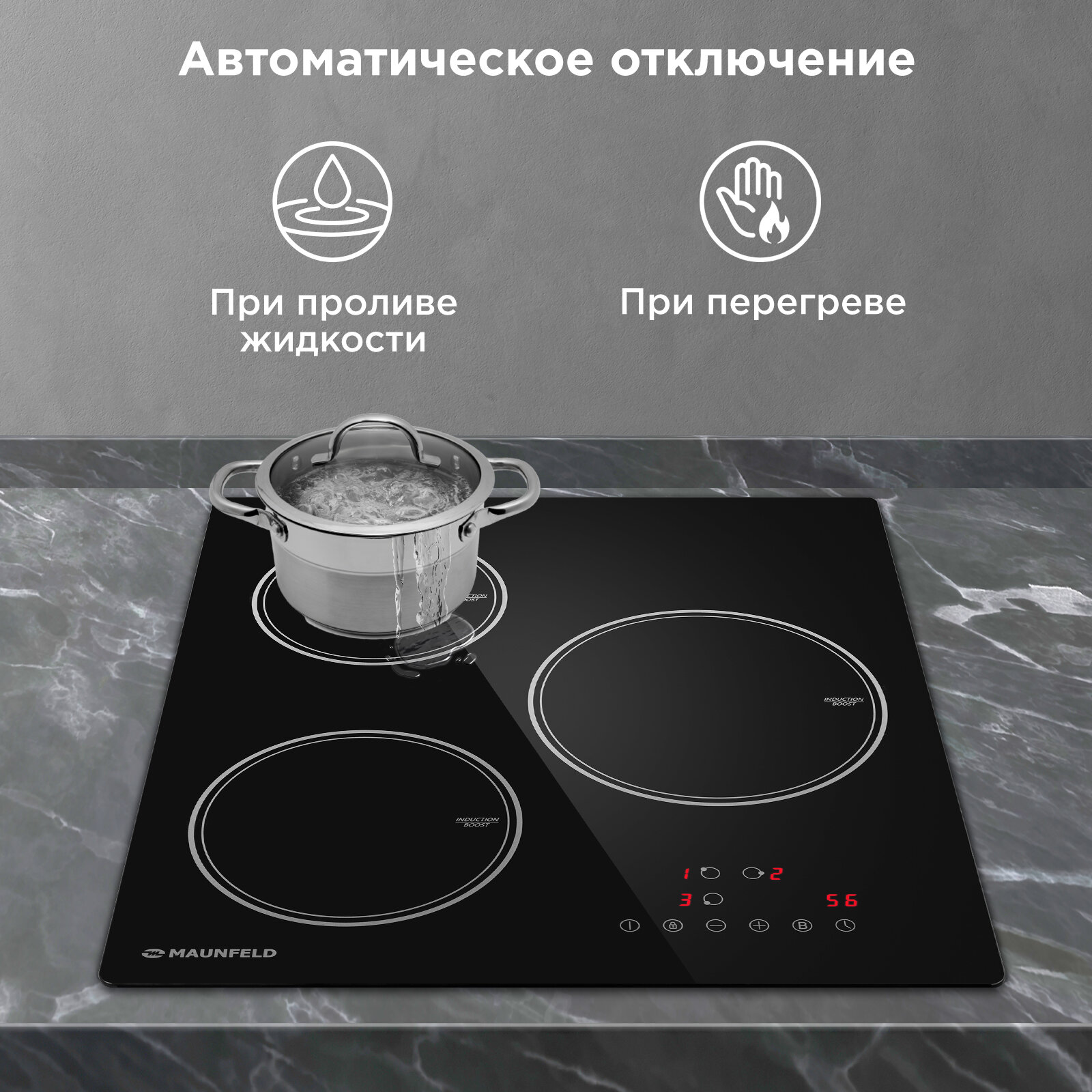 Индукционная варочная панель MAUNFELD AVI453BK черная стеклокерамика, 6.2 кВт, 3 конфорки, автоматическое отключение, защита от детей, распознавание посуды, таймер, Booster, гарантия 3 года