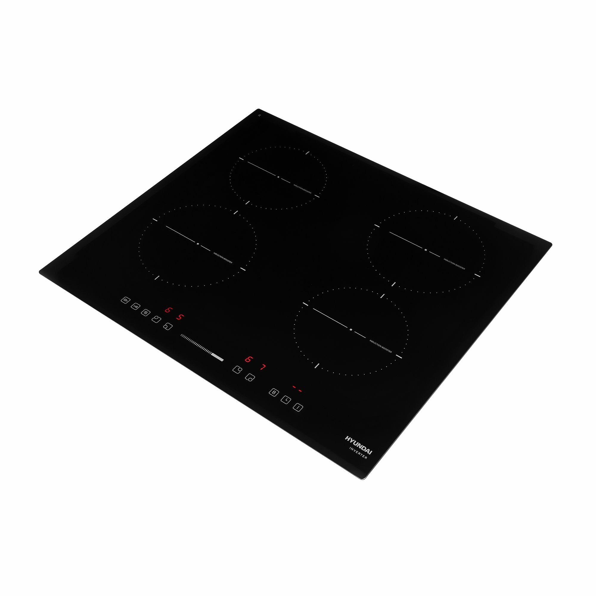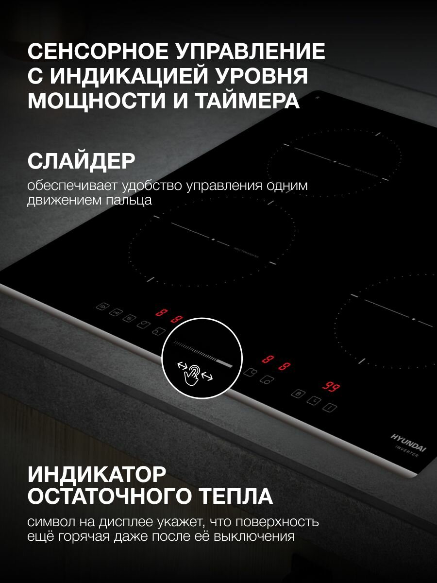 Индукционная варочная поверхность Hyundai HHI 6772 BG, Слайдерное управление, Итальянская стеклокерамика, таймер, функция автозакипания, функция паузы , передний скошенный край рамки , черный