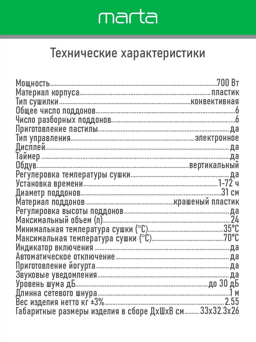 Дегидратор сушилка для овощей электросушилка MARTA MT-FD1888A 8 поддонов (4 основных + 2 для пастилы + 2 для ягод) белый