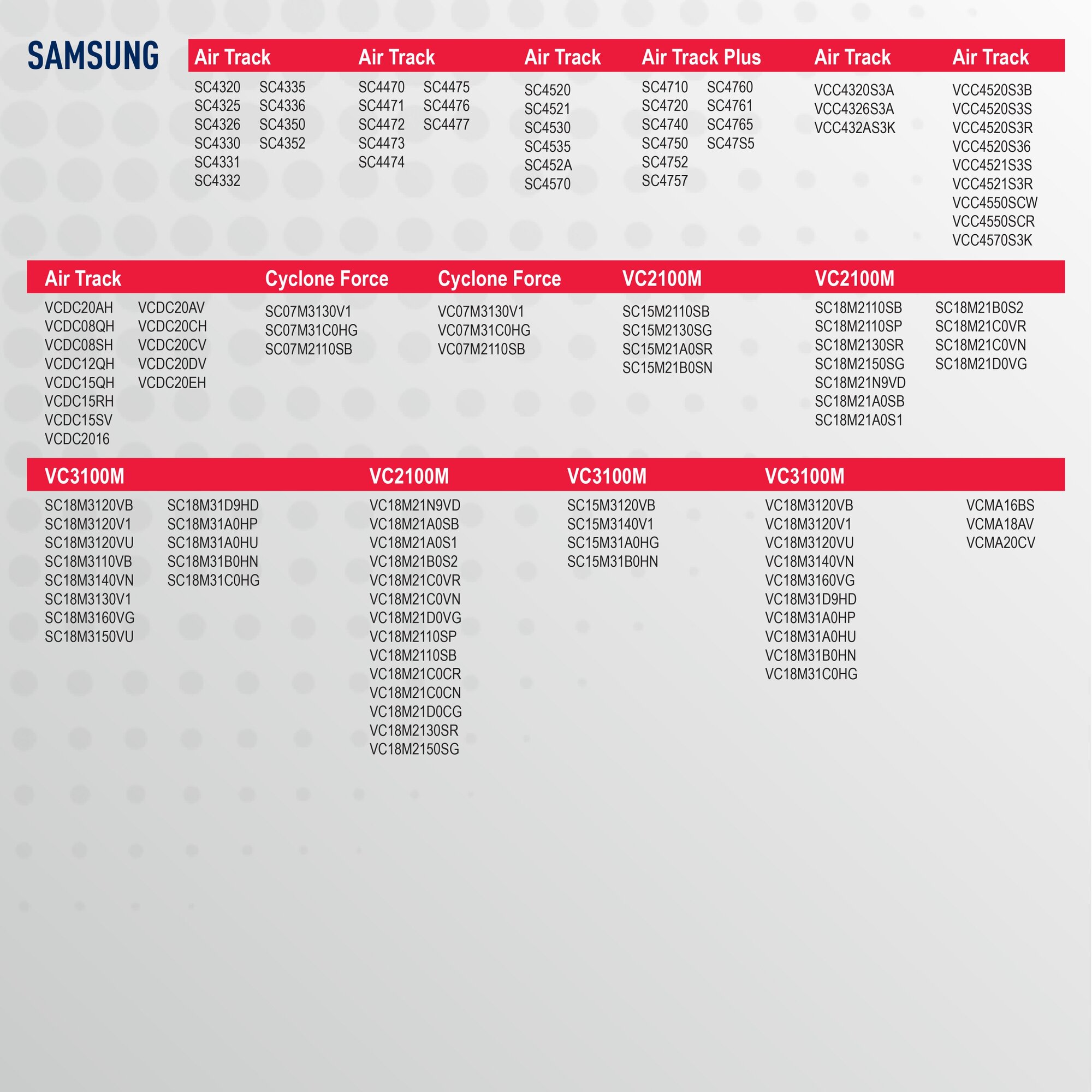 | Совместимые модели | SAMSUNG Air Track: SC4325, SC 4330, SC 4331, SC 4335, SC 432A, SC 4350, SC 4326, SC 4332, SC 4336, SC 4352, SC 4470, SC 4471, SC4472, SC 4473, SC4474, SC4475, SC4476, SC4477, SC 4520, SC 4521, SC 4530, SC 4535, SC 452A; Air Track Plus: SC 4710, SC 4720, SC 4740, SC 4750, SC 4752, SC 4757, SC 4760, SC 4761, SC 4765, SC 47S5; VCMA…: VCMA16BS, VCMA18AV, VCMA20CV; VC2100M: SC18M2110SB, SC18M2110SP, SC18M2130SR, SC18M2150SG, SC18M21A0SB, SC18M21A0S1, SC18M21B0S2, SC18M21C0VR, SC18M21C0VN, SC18M21D0VG, SC15M2110SB, SC15M2130SG, SC15M21A0SR, SC15M21B0SN; VC3100M: SC18M3120VB, SC18M3120V1, SC18M3120VU, SC18M3110VB, SC18M3140VN, SC18M3130V1, SC18M3160VG, SC18M3150VU, SC18M31A0HP, SC18M31A0HU, SC18M31B0HN, SC18M31C0HG, SC15M3120VB, SC15M3140V1, SC15M31A0HG, SC15M31B0HN |