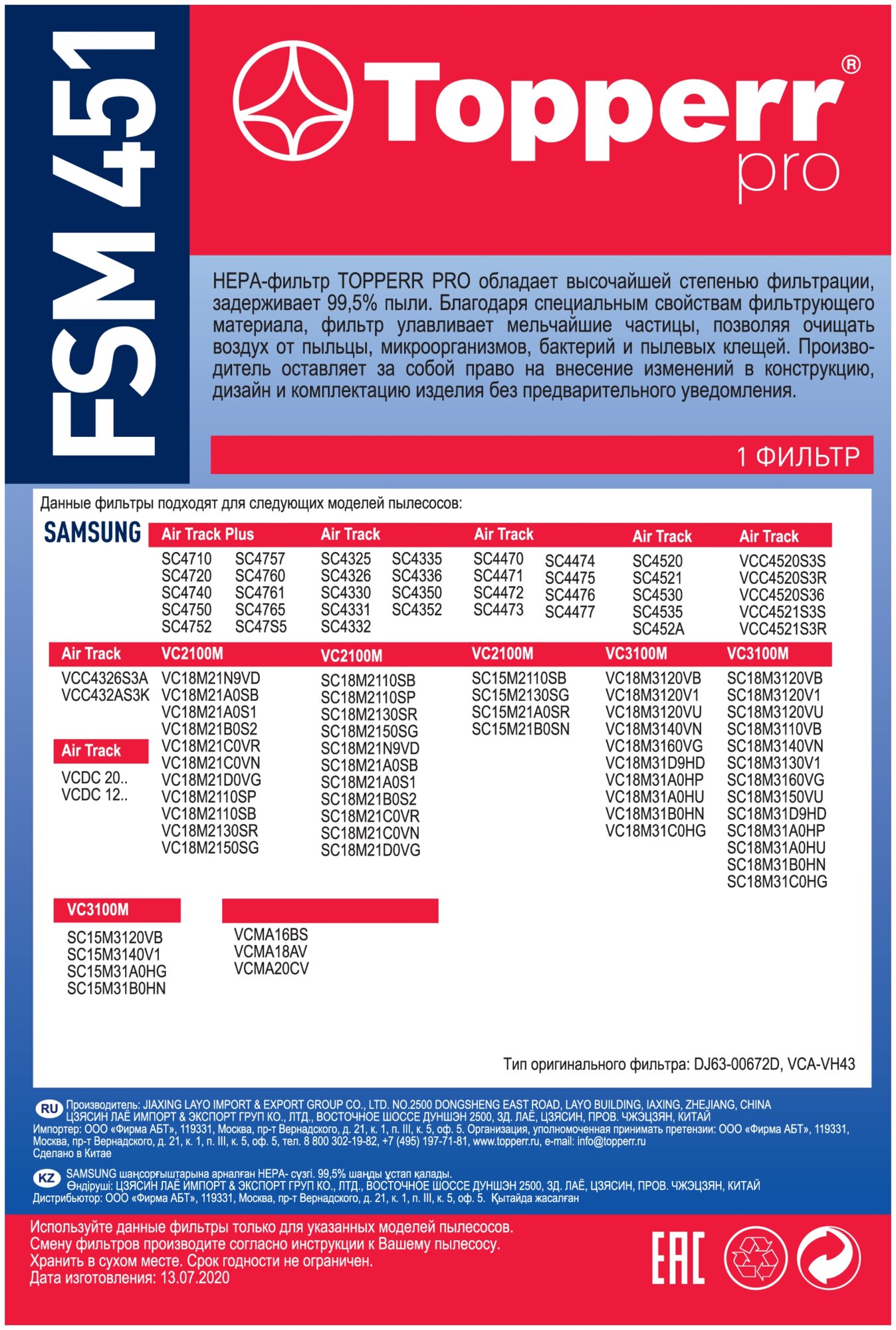 Фильтр Topperr FSM 451, для пылесосов Samsung, HEPA-фильтр, 0,1 кг интересное: