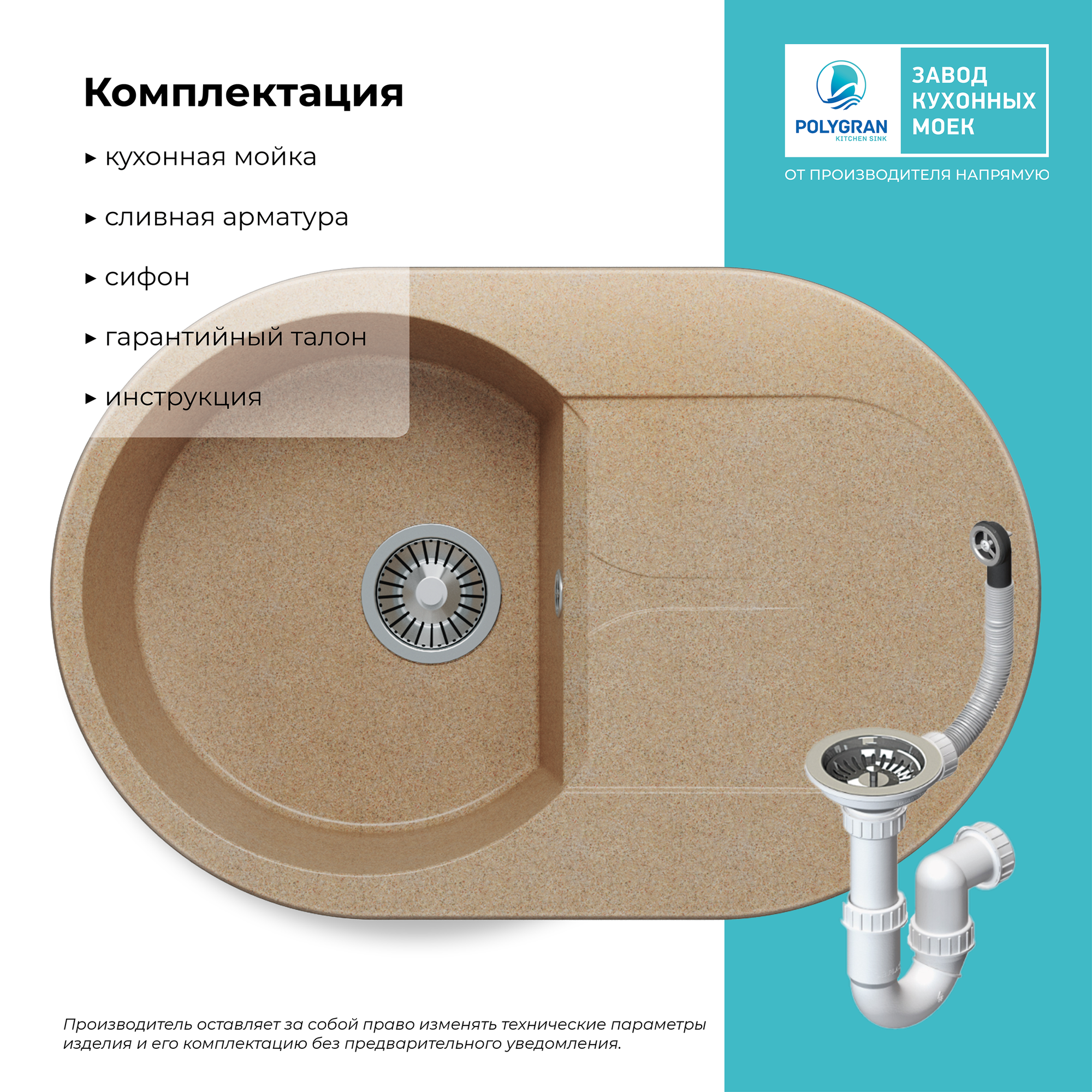 СохранитьМойка для кухни каменная POLYGRAN ATOL-760, бежевая, врезная, круглая, с крылом (№302 Песочный) интересное: