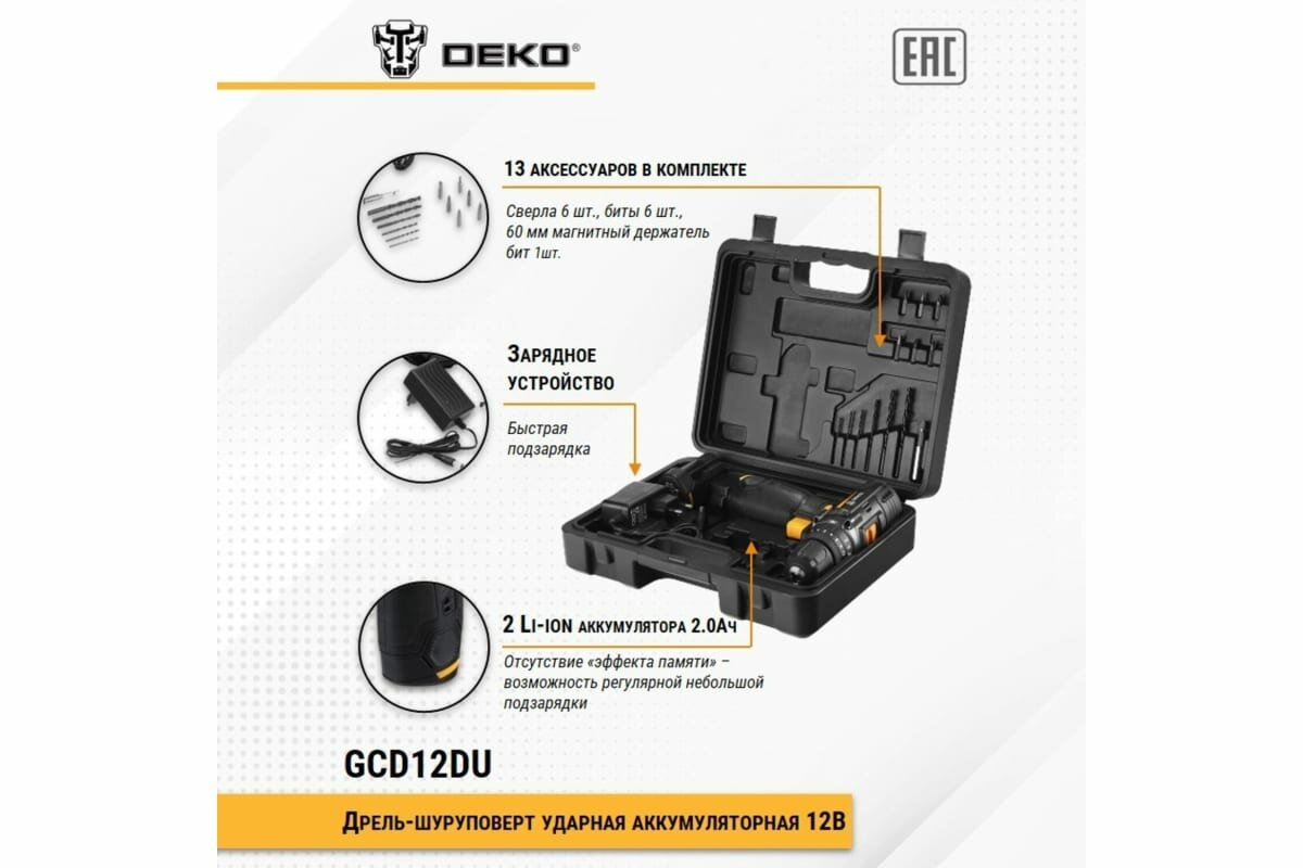 Дрель-шуруповерт ударная аккумуляторная Deko Gcd12du SET4 в кейсе + оснастка 13 шт, 12В, 2x2.0Ач
