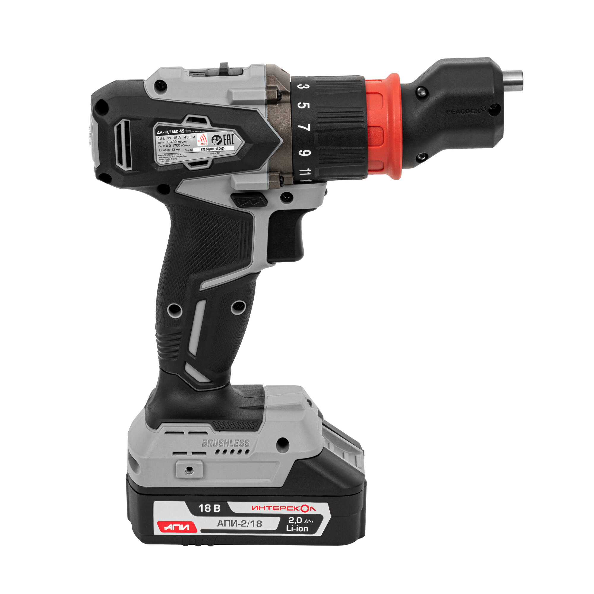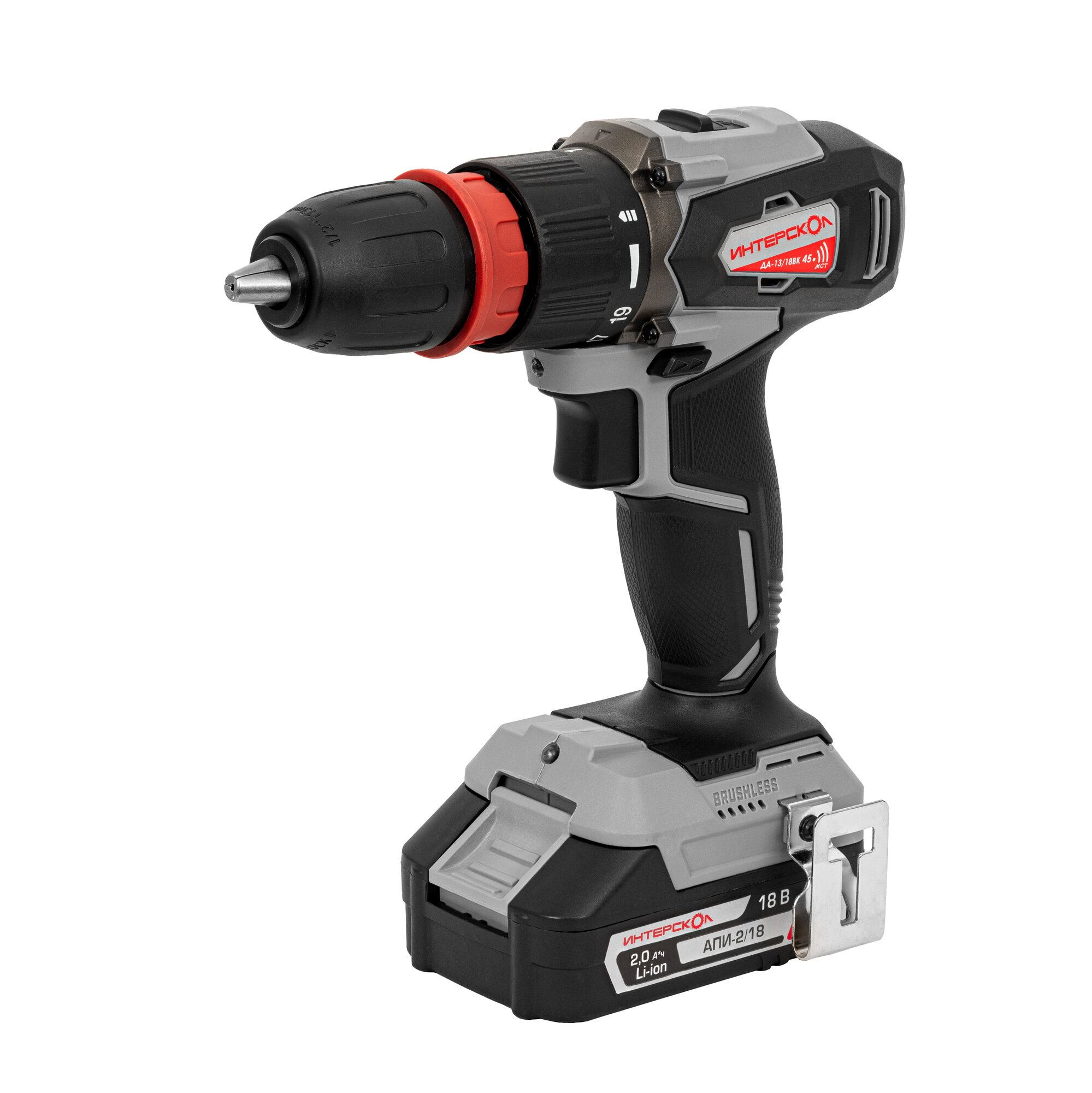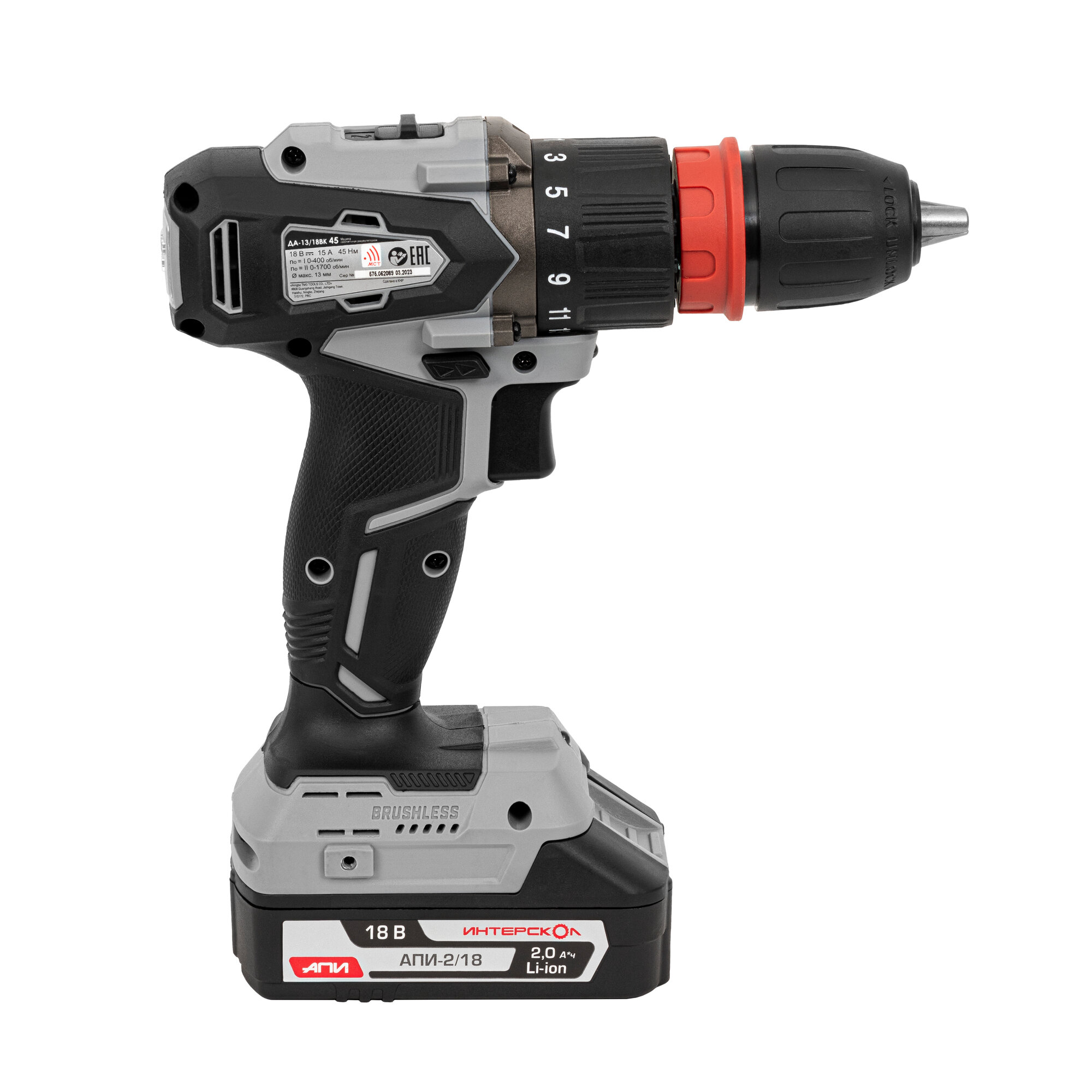 Дрель-шуруповерт аккумуляторная ИНТЕРСКОЛ ДА-13/18ВК 45 комби (АПИ, бесщёточный привод, Li-ion, кейс, 1,5Ач, 2 аккум., ЗУ)