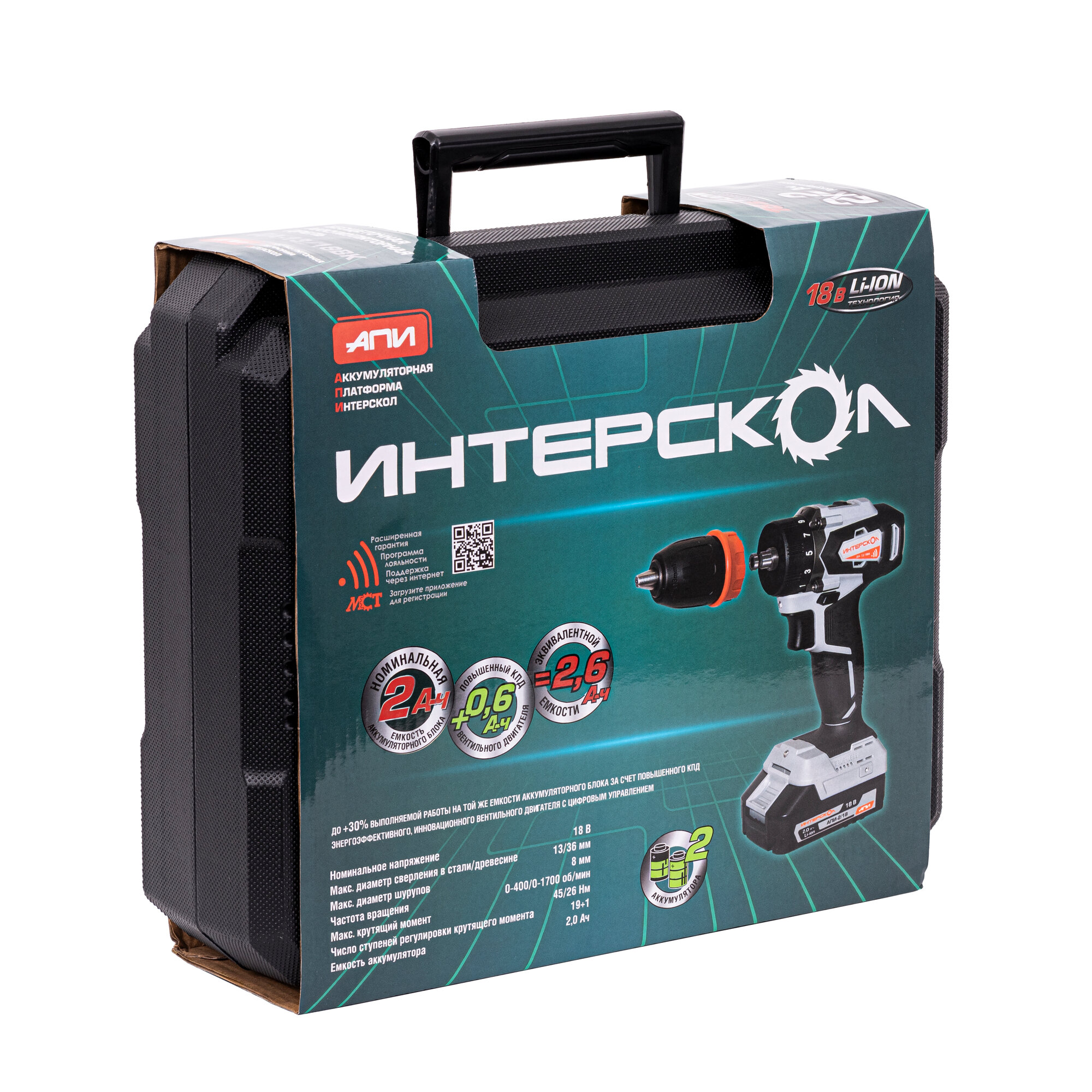 Дрель-шуруповерт ИНТЕРСКОЛ комби ДА-13/18ВК 45, 575.2.2.78, от аккумулятора,АПИ 18 В, 45 Нм, 1700 об/мин, c 2 АКБ 2 Ач и ЗУ, в кейсе