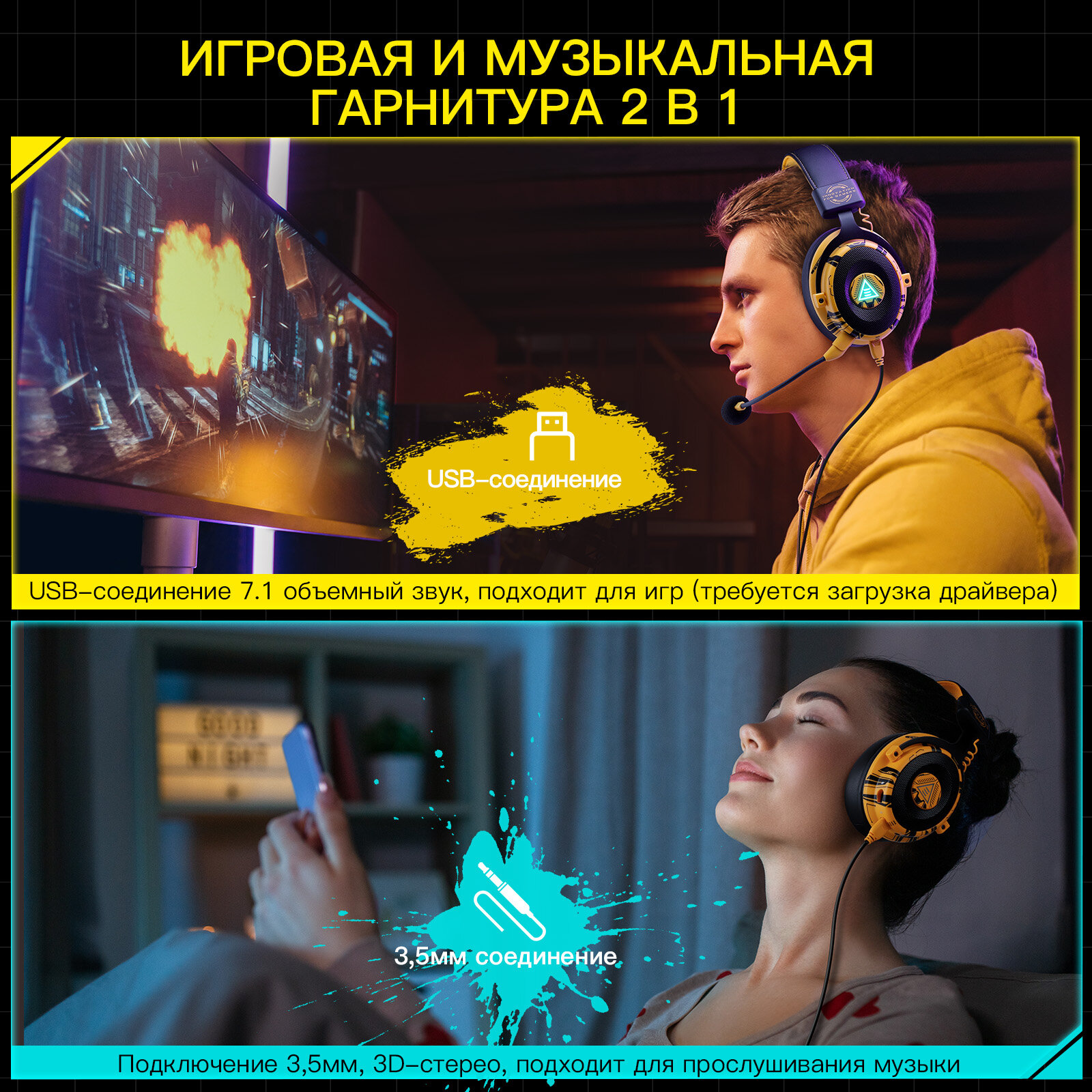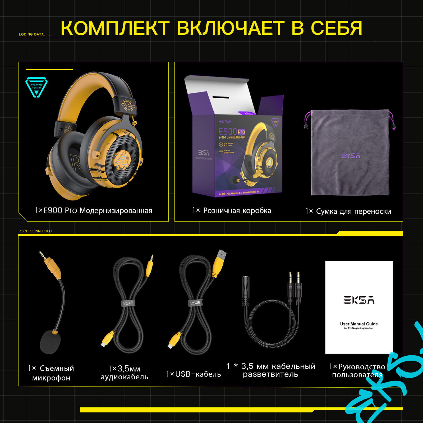 Игровая гарнитура EKSA E900 Pro Yellow, желтого цвета с черной отделкой, съемный микрофон интересное: