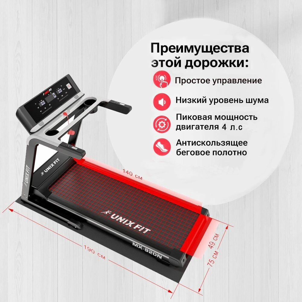 Беговая дорожка UNIXFIT MX-920N + коврик, 3,25 л.с., до 150 кг, скорость 1.0 - 20 (шаг 0.1) км/ч, 8 цилиндрических эластомеров