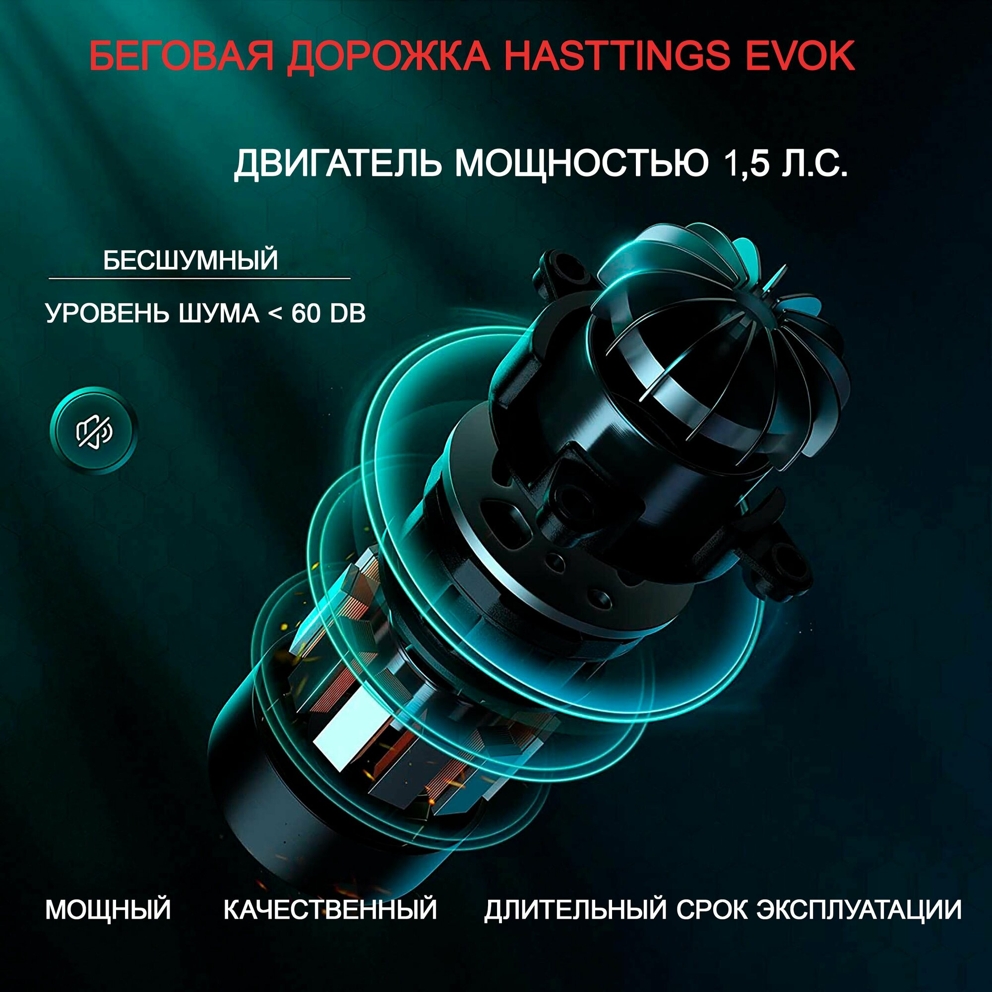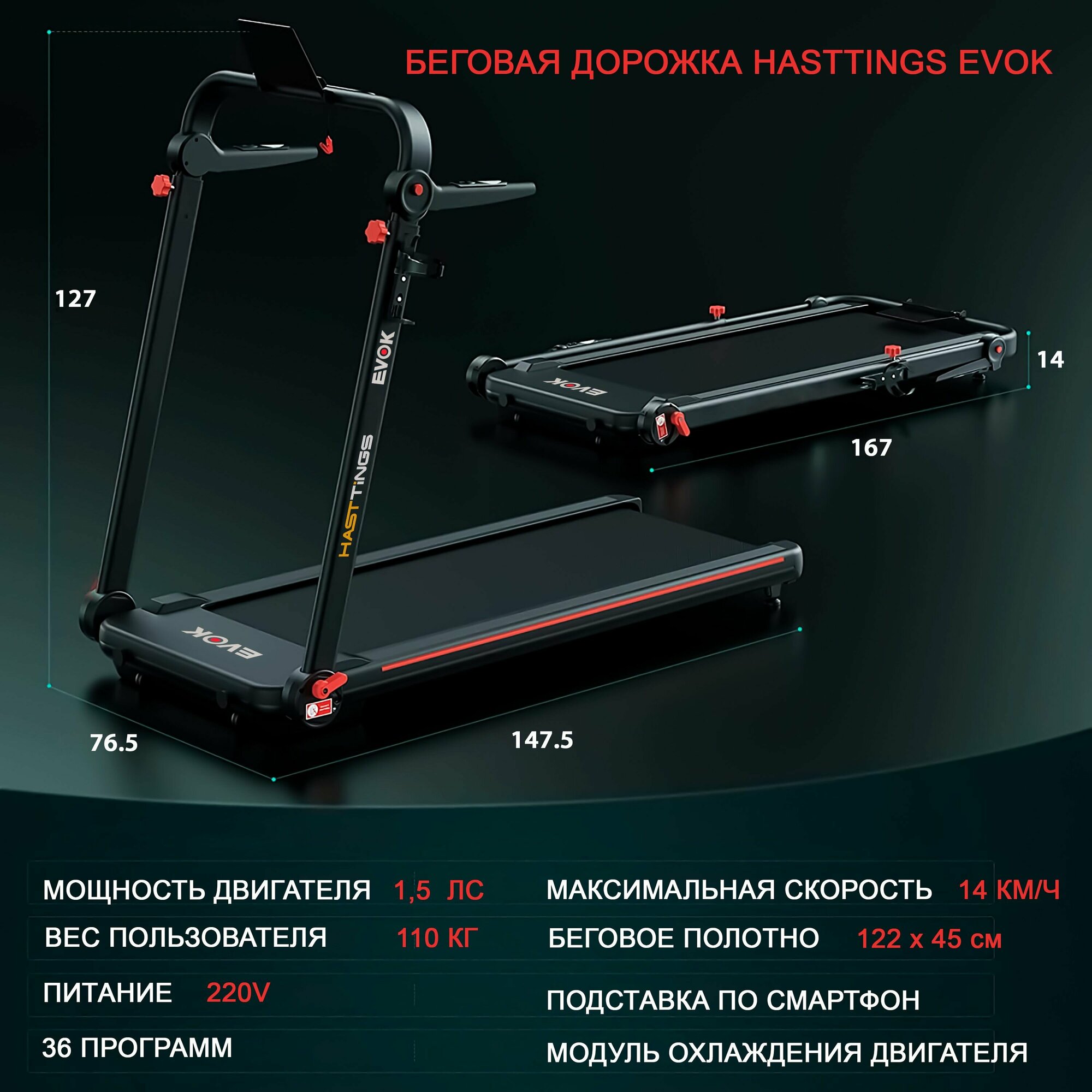 Беговая дорожка Hasttings EVOK - складная/ до 110 кг/ до 300 ккал за 1 ч/компактная/ 1,5 л.с/ 36 программ/ модуль охлаждения двигателя