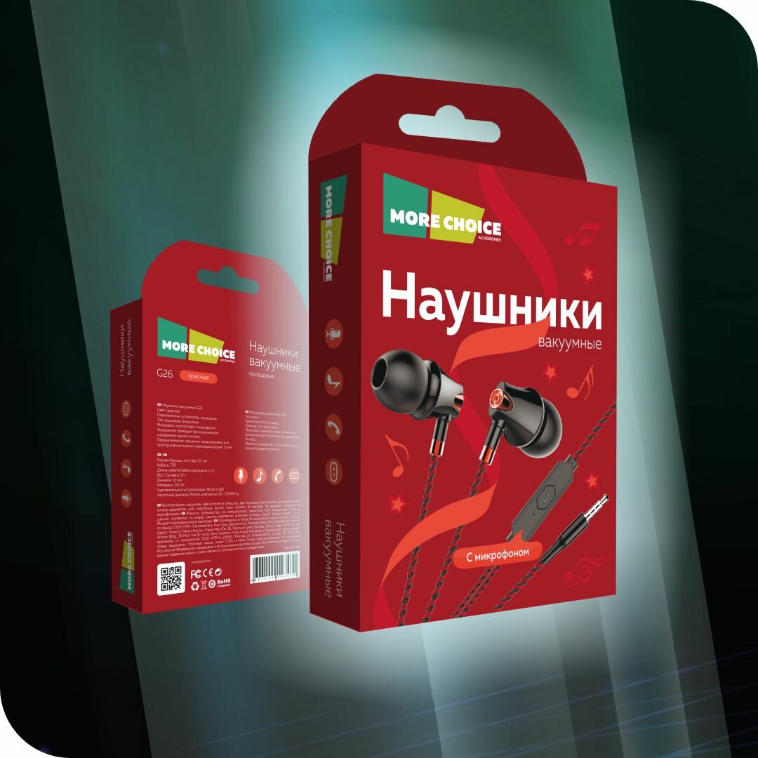Наушники MORE CHOICE G26 проводные, вакуумные, 1,1м, черный/красный