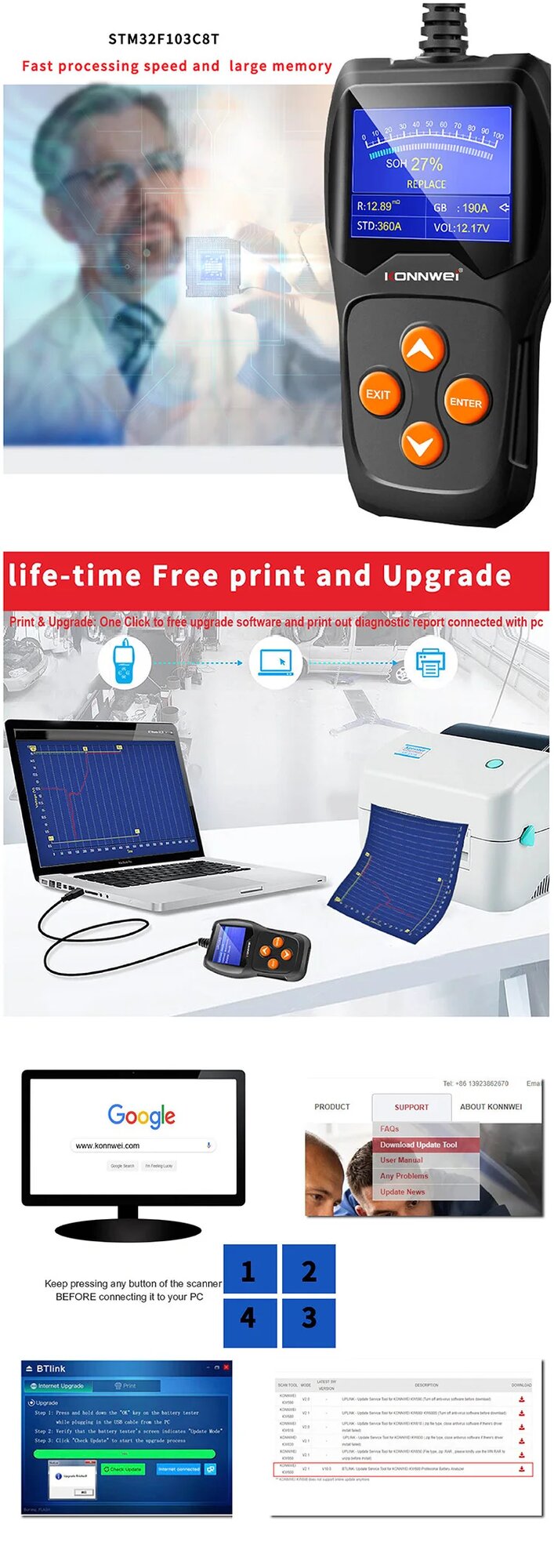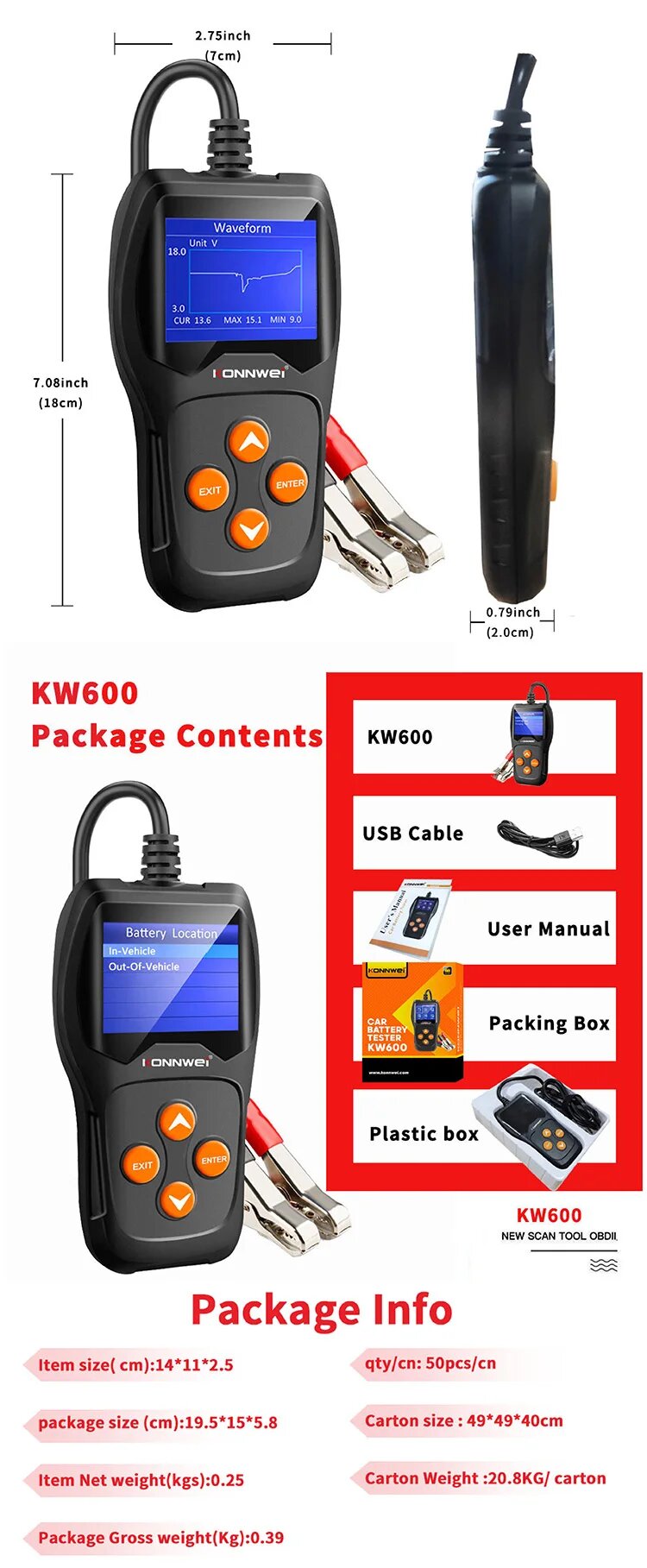 | Дополнительная информация | экран: цветной TFT LCD с подсветкой, 2.4 дюйма; напряжение: от 8В до 16В; поддерживаемые типы АКБ: CCA, ICE, EN, DIN, CA, BCI, MCA, SAE, GB, JIS; вид питания: 12В; поддержка русского языка; удобная и понятная операционная система, цветной экран с подсветкой; определение состояния батареи; результаты: хорошее, требуется зарядка, замените АКБ; проверка емкости АКБ: информация о холодном запуске (CCA), DIN, EN и IEC относительно номинальной емкости батареи; проверка внутреннего сопротивления (Ом); отображение заряда аккумулятора в процентах (%); тест на запуск двигателя, нагрузочный тест; тест зарядки аккумулятора, пульсации напряжения; график изменений напряжения, мониторинг и обзор в реальном времени; хранение и просмотр всех результатов испытаний на тестере; возможность распечатать/загрузить все результаты испытаний и отчет о работе батареи на ПК для глубокого анализа; обновление прошивки с помощью приложения BTlink с официального сайта Konnwei KW600 |