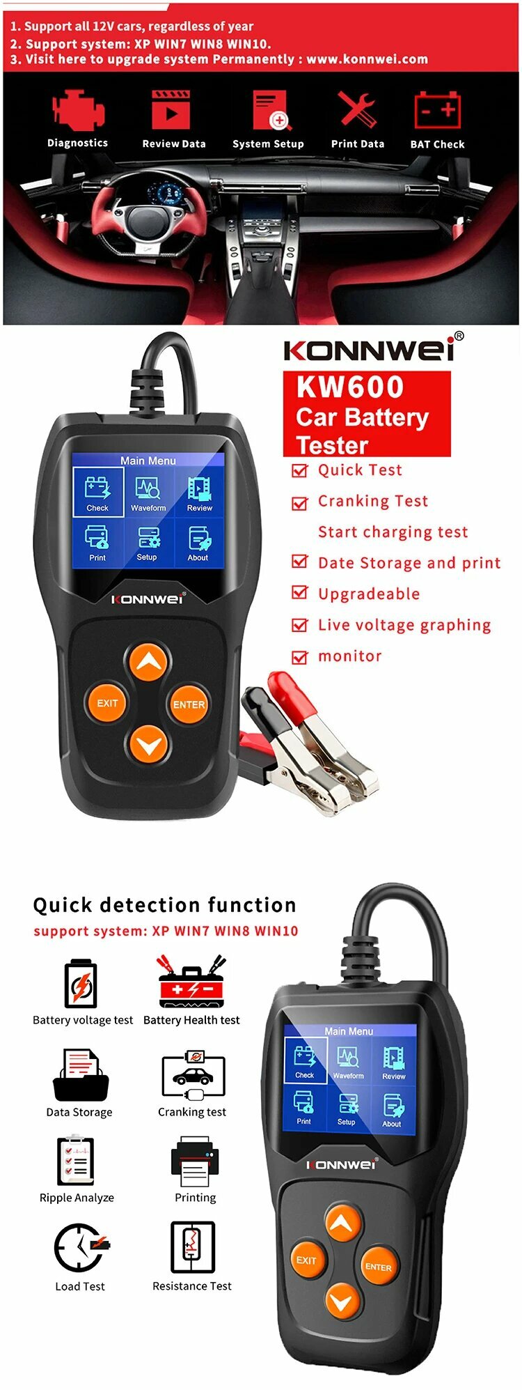 Автомобильный тестер батарей АКБ автомобилей Konnwei KW600