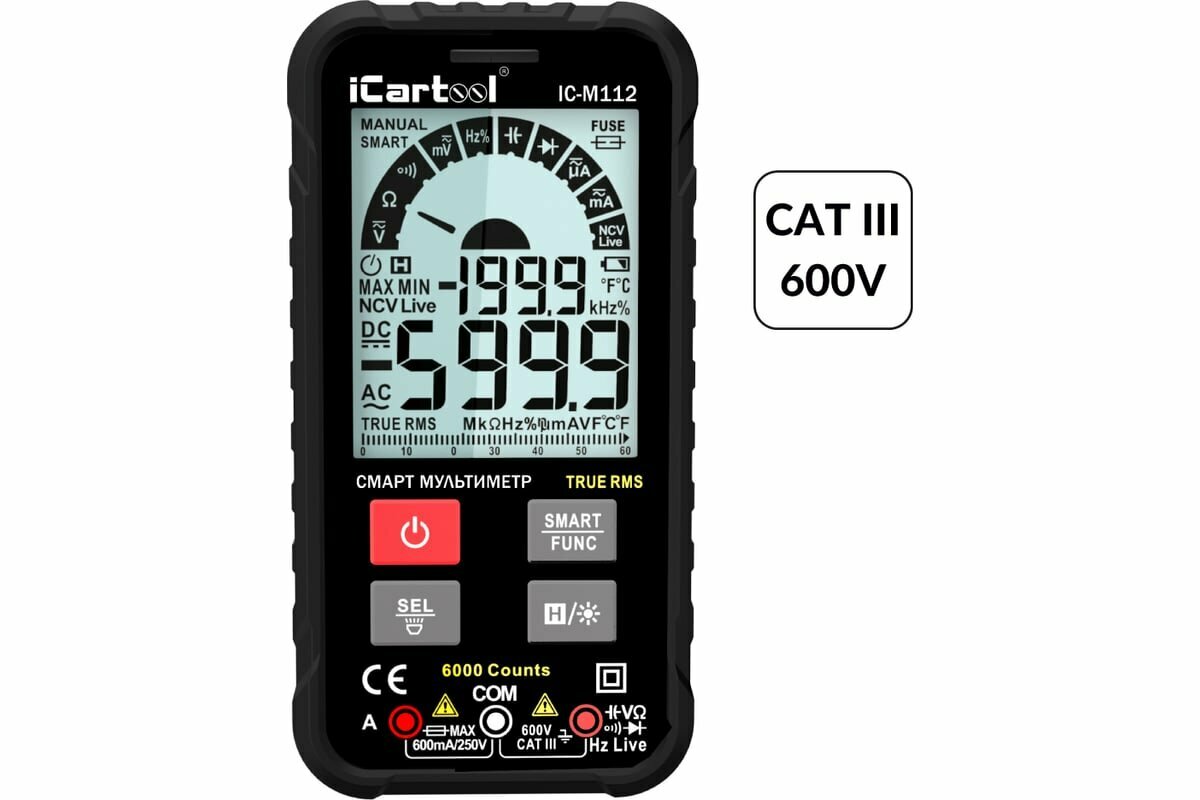 Цифровой смарт мультиметр с подсветкой экрана CATIII 600V, TrueRMS, AC/DC iCartool IC-M112