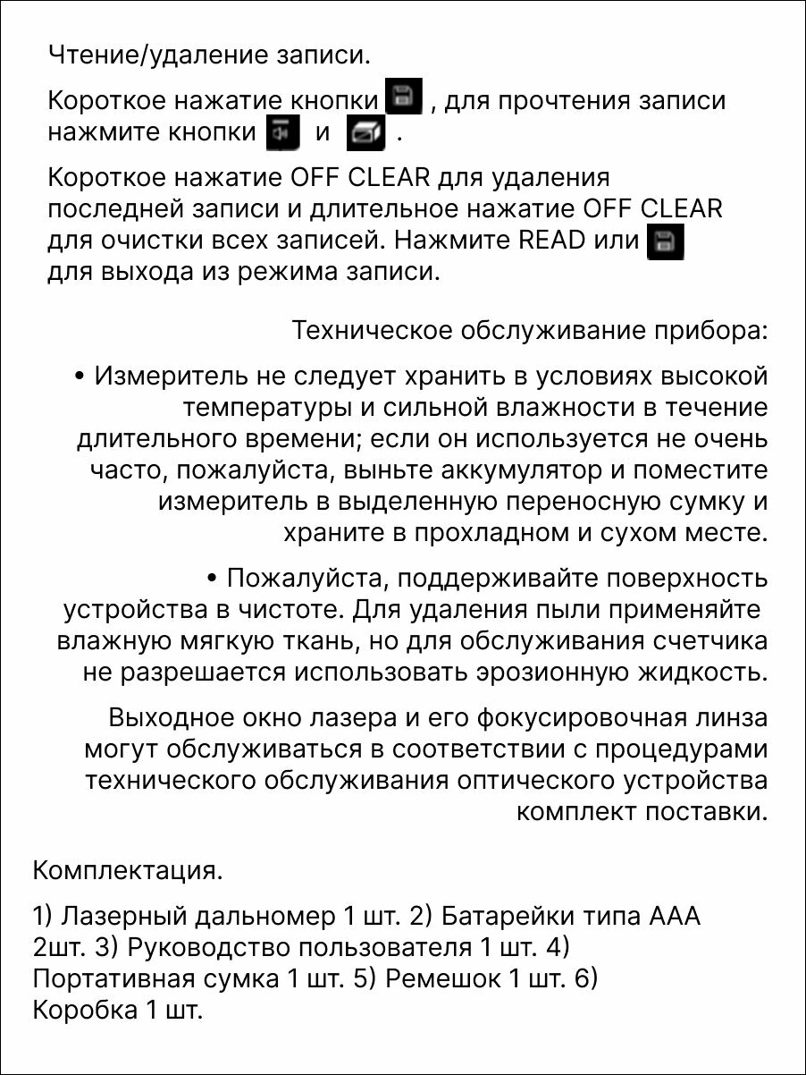| Отзыв: | Очень удобный и функциональный прибор, можно замерять не только расстояние но и сразу высчитывать объëм, углы и прочее. Работает быстро, мерит точно, есть пузырьковый уровень прямо на приборе. Единственный минус не отбивает заявленное расстояние, в характеристиках указана дальность 50 метров, по факту расстояние в два раза меньше, дальше чем 25 метров выдаёт ошибку, не добивает до препятствия. Возможно причина в ярком освещении или если прибор намертво зафиксировать в штативе он и будет фиксировать расстояние на заявленные характеристики. |