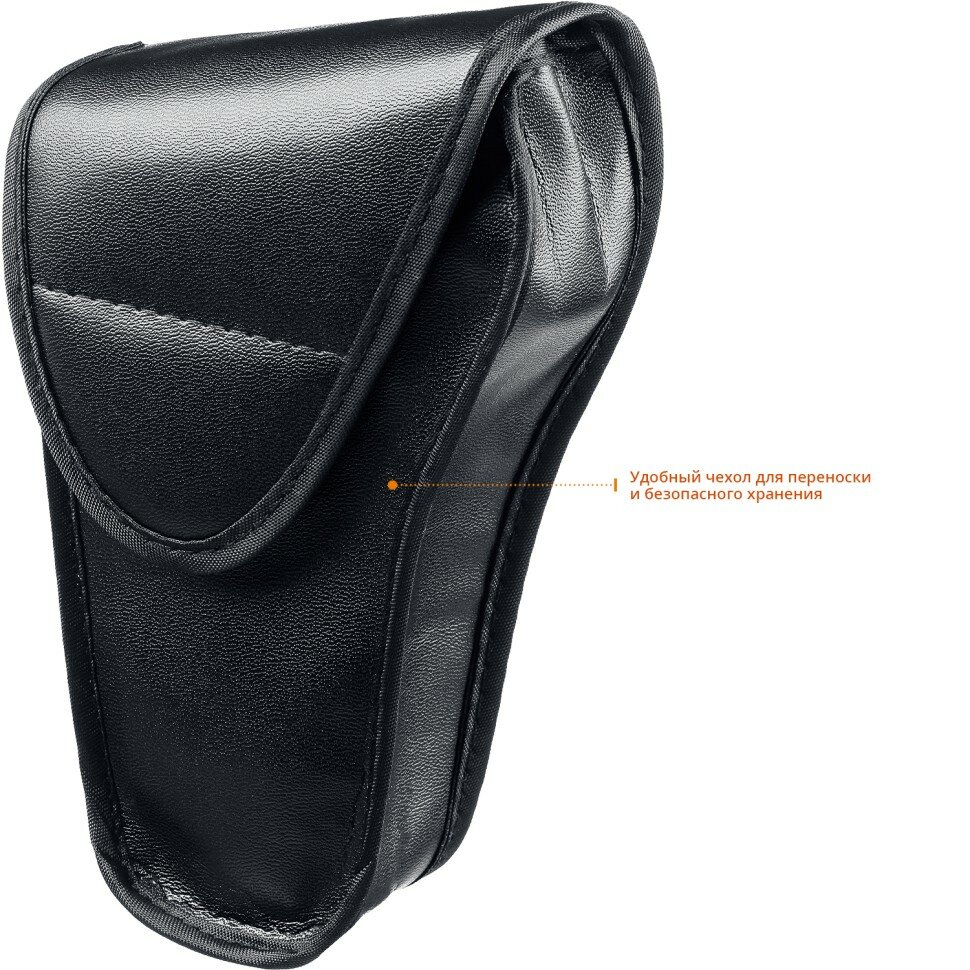 Есть чехол. Есть возможность отключения лазера. Удобный в управлении. Цветное, информированное, с большими цифрами табло управления. |