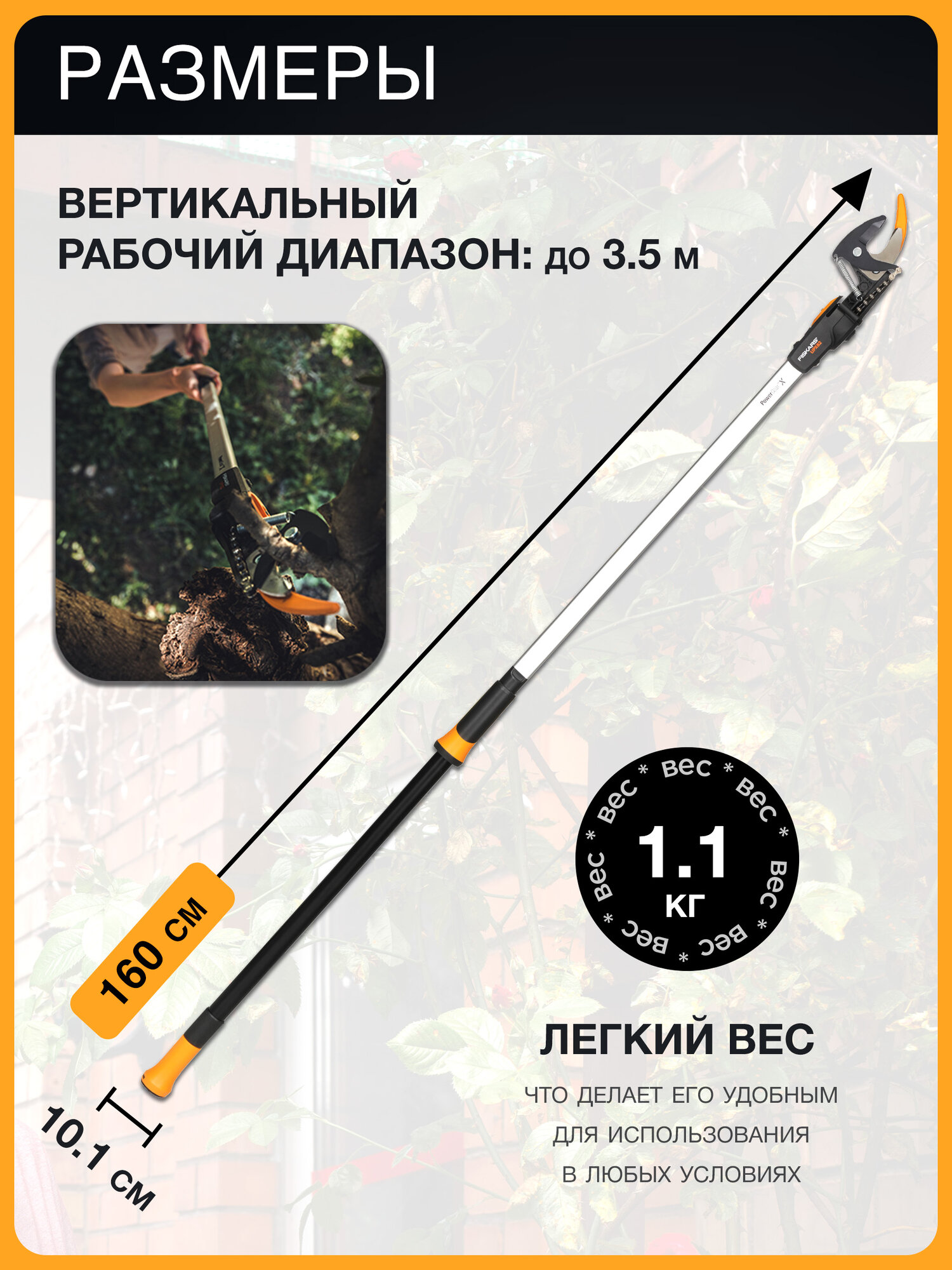 | Дополнительная информация | регулируемый угол режущей головки до 230°, вертикальный рабочий диапазон до 4,5 метров, механизм блокировки штанги; может использоваться с удлинительной штангой и корзинкой для сбора фруктов |