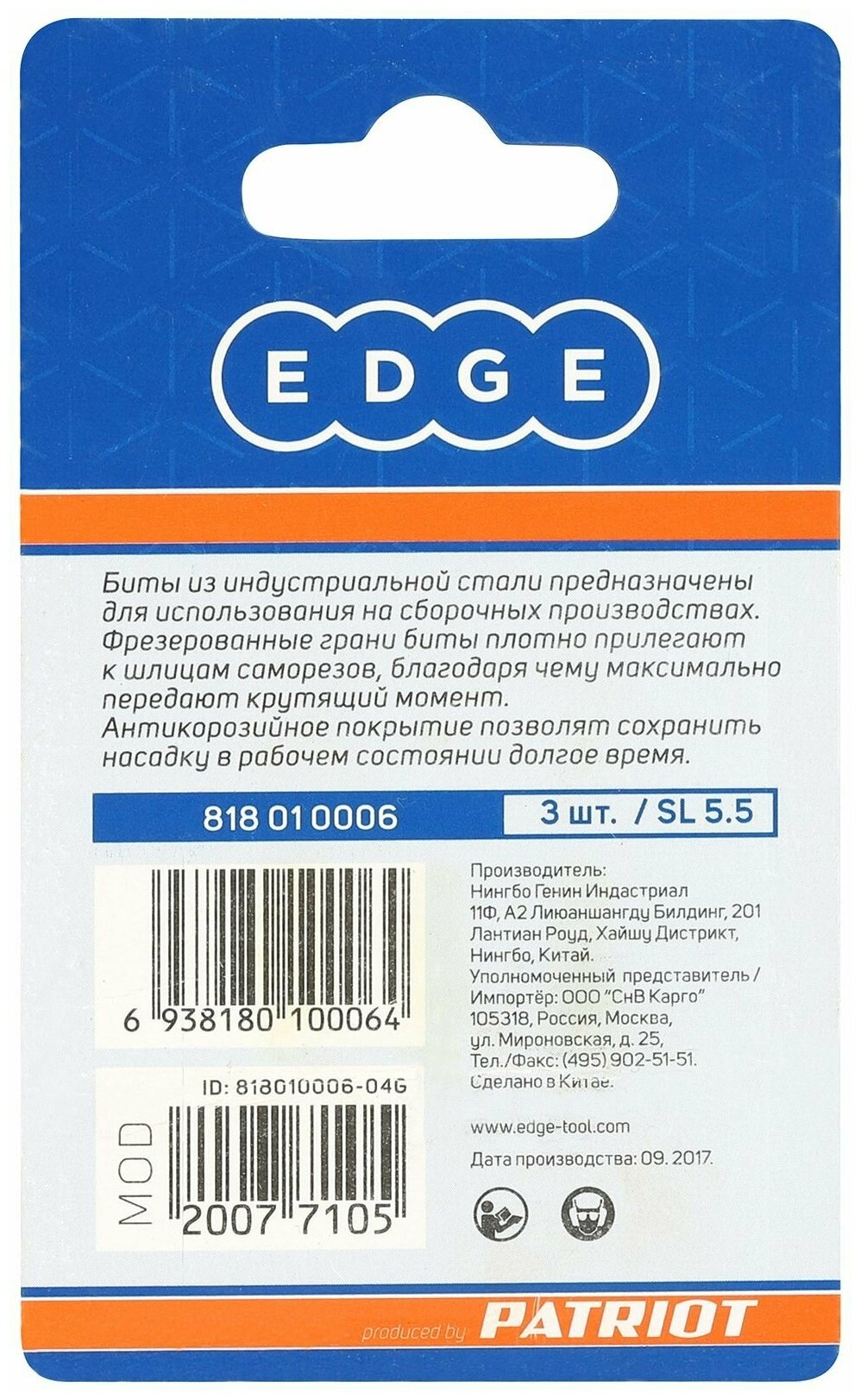 EDGE by PATRIOT Бита SL 5.5.мм длина 25 мм, 3шт в блистере 818010006