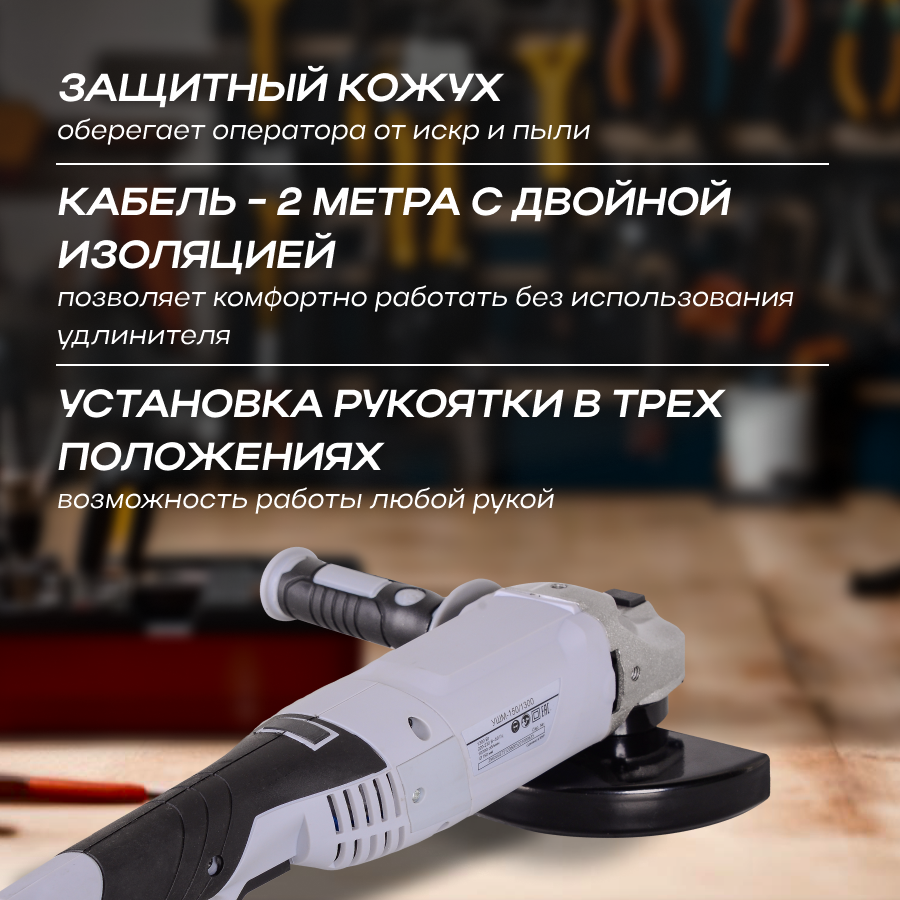 Отличная болгарка, диаметр диска самый популярный, в магазинах полно чашек, дисков, и других насадок для работы. Весит немного больше двух килограммов, в руках держать не сложно, дополнительная ручка удобно расположена. Для безопасности кнопка включения блокируется.