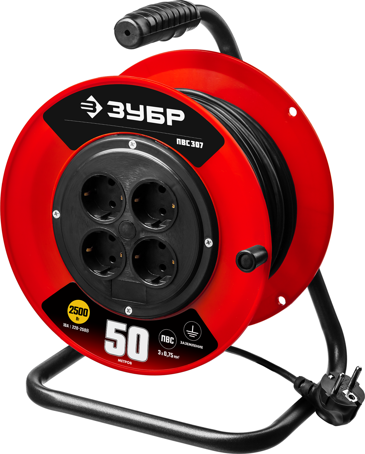 Удлинитель на катушке ПВС 307, 50 м, 2500 Вт, 4 гнезда, ПВС 3х0,75 кв мм, ЗУБР