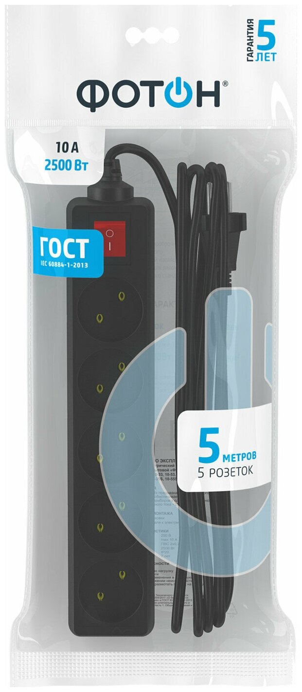 Удлинитель сетевой для розетки фотон 10А 5м 5 розеток с выключателем черный, ГОСТ