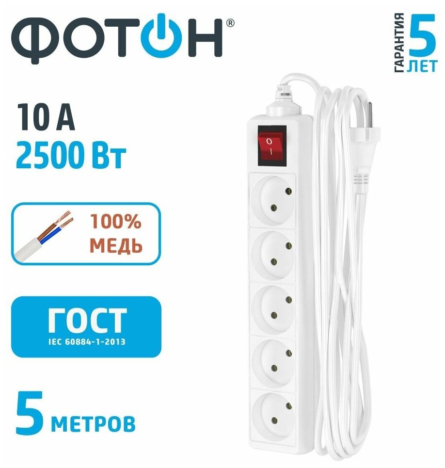 Удлинитель сетевой для розетки ФОТОН 10А 5м 5 розеток с выключателем белый, ГОСТ