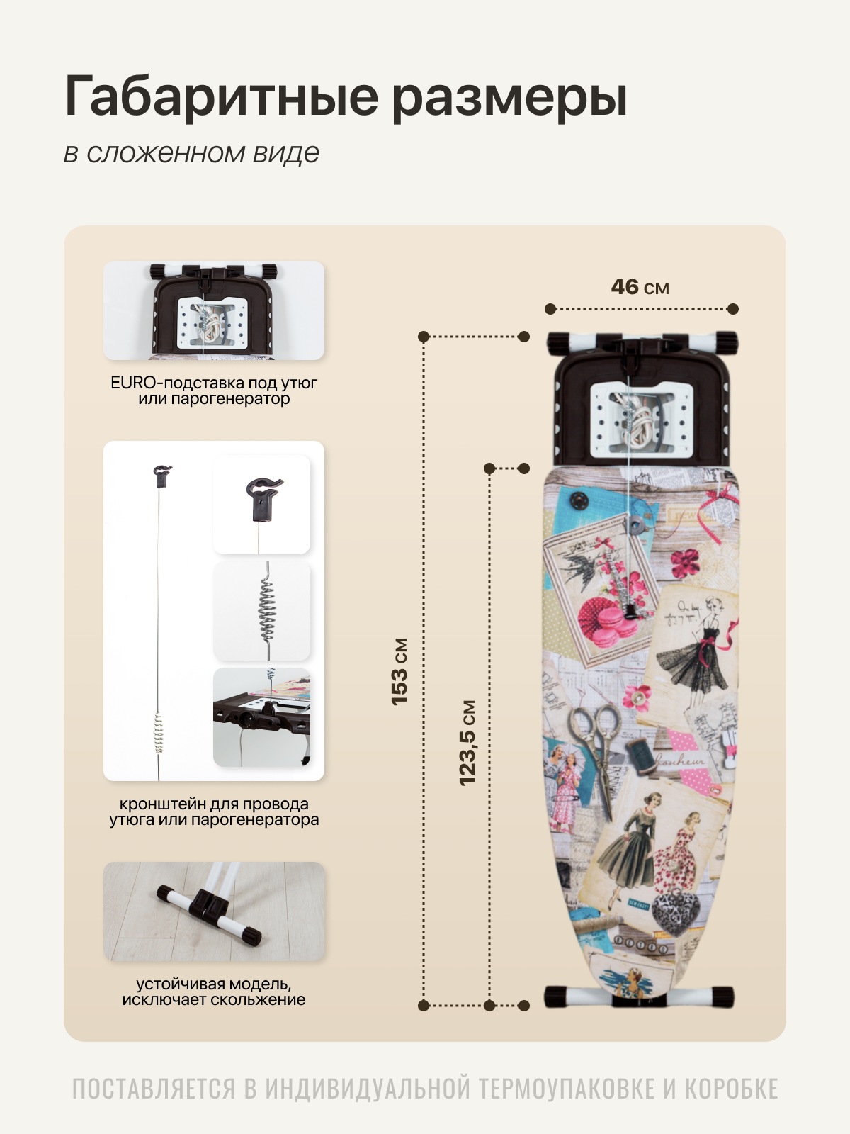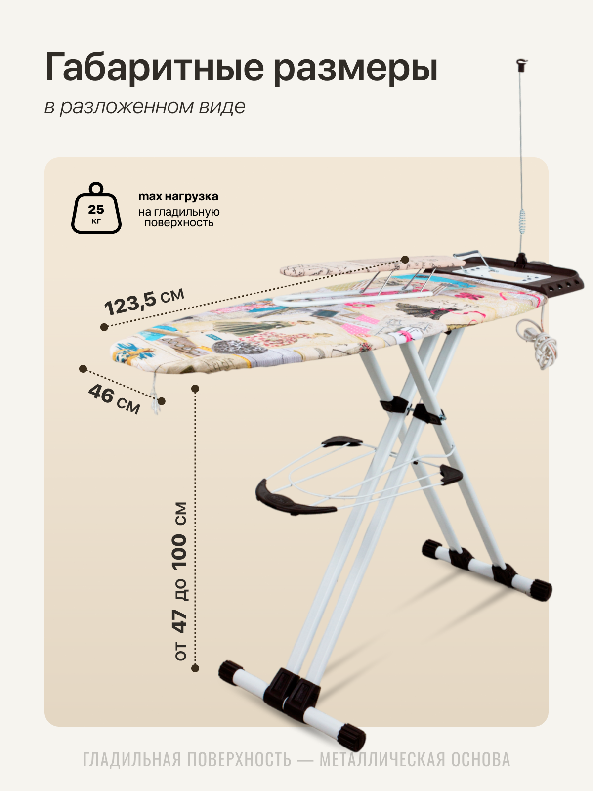 Гладильная доска Ника Валенсия 1 НВ1/19 (в стиле "Де Жуи", материал металл, напольная, широкая, подставка под утюг, плавная регулировка высоты, шнур 1.6м, подрукавник в комплекте)
