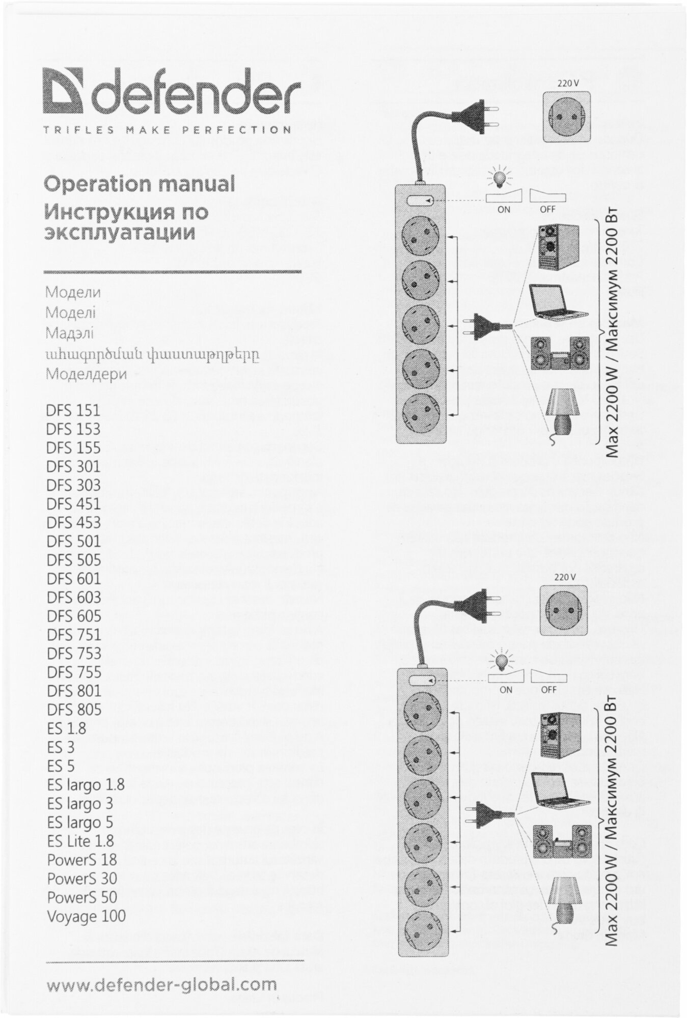 Сетевой фильтр Defender DFS 151, 2200Вт, IP20, длина кабеля 1.8м